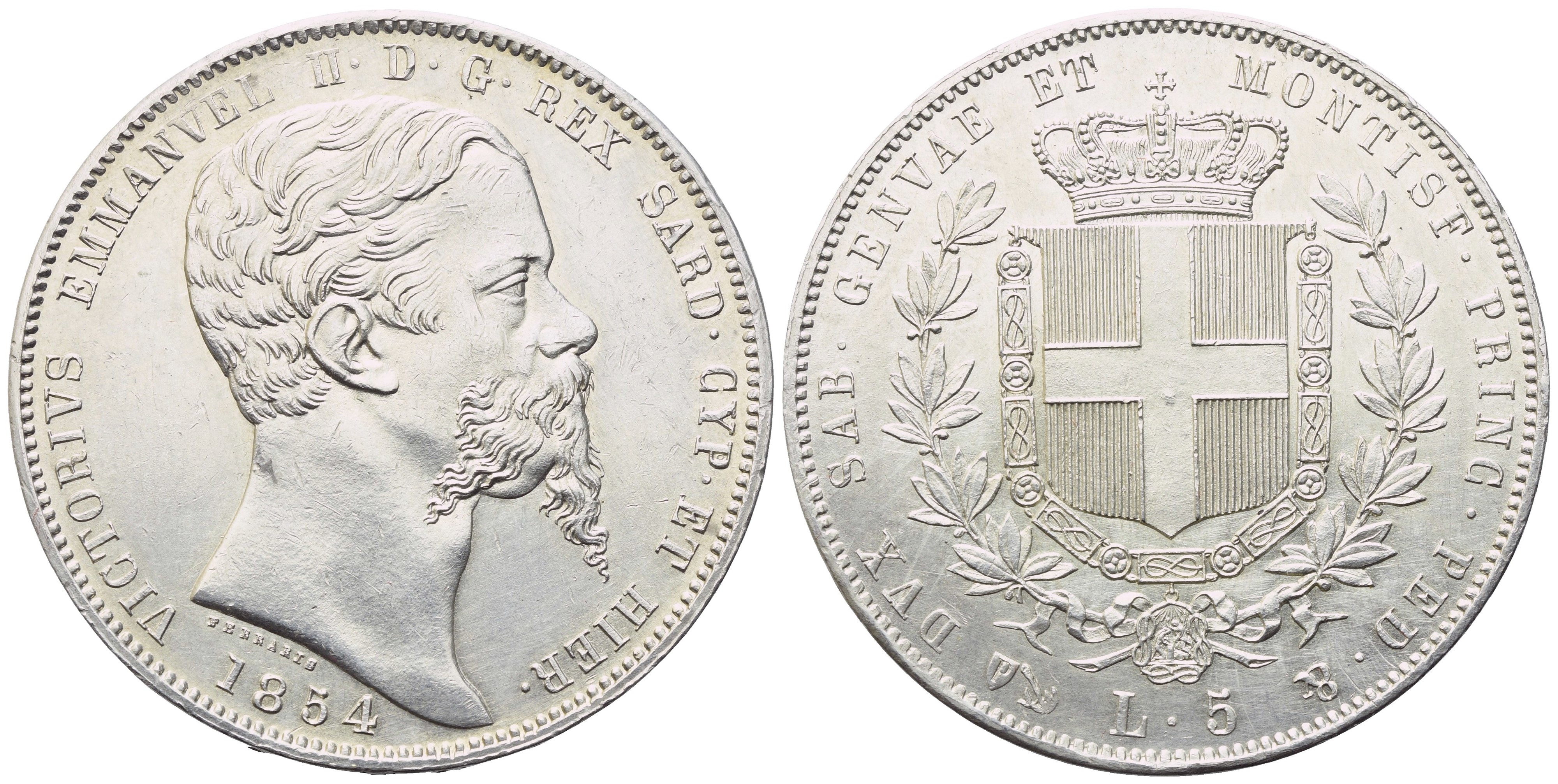 VICTORIVS EMMANVEL II D G REX SARD CYP ET HIER Testa nuda a destra; sotto il collo, FERRARIS; in basso, 1854. Rv. DVX SAB GENVAE ET MONTISF PRINC PED & Stemma crociato e coronato, con il Collare dell'Annunziata, tra due rami di lauro. Gig. 37; Pag. 377. Rara. qFDC. Impercettibili segnetti. Fondi lucenti.