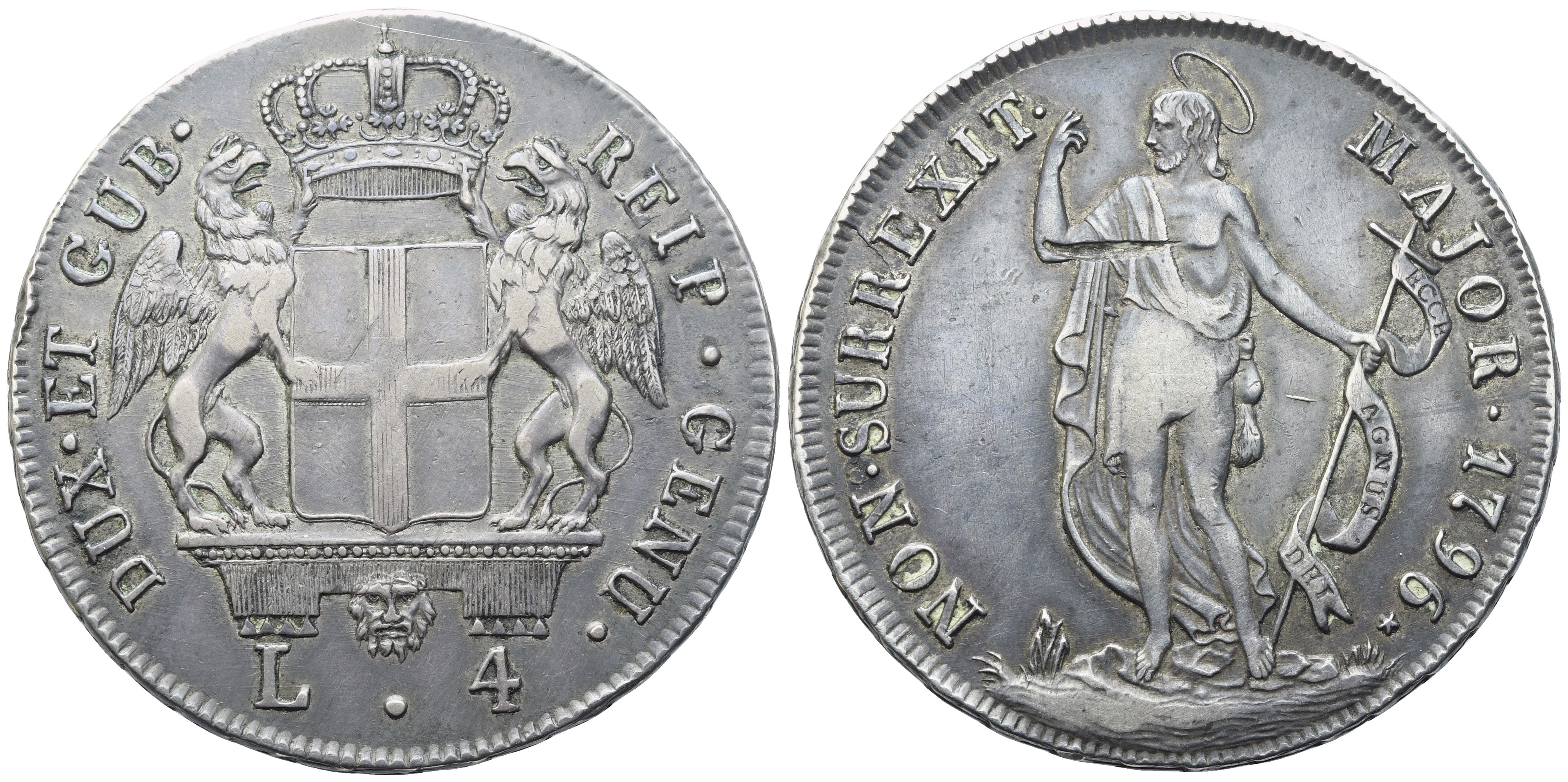DUX ET GUB REIP GENU Stemma della Repubblica coronato tra due grifi alati, poggiato su base decorata con maschera leonina; in esergo, L 4. Rv. NON SURREXIT MAJOR 796 San Giovanni stante e frontale, con il capo rivolto a sinistra, mano desra sollevata in atto di benedire, tiene lunga croce con cartiglio: ECCE AGNUS DEI. CNI 11; Lunardi 367 (R2); MIR 313/4. Rara. BB/SPL