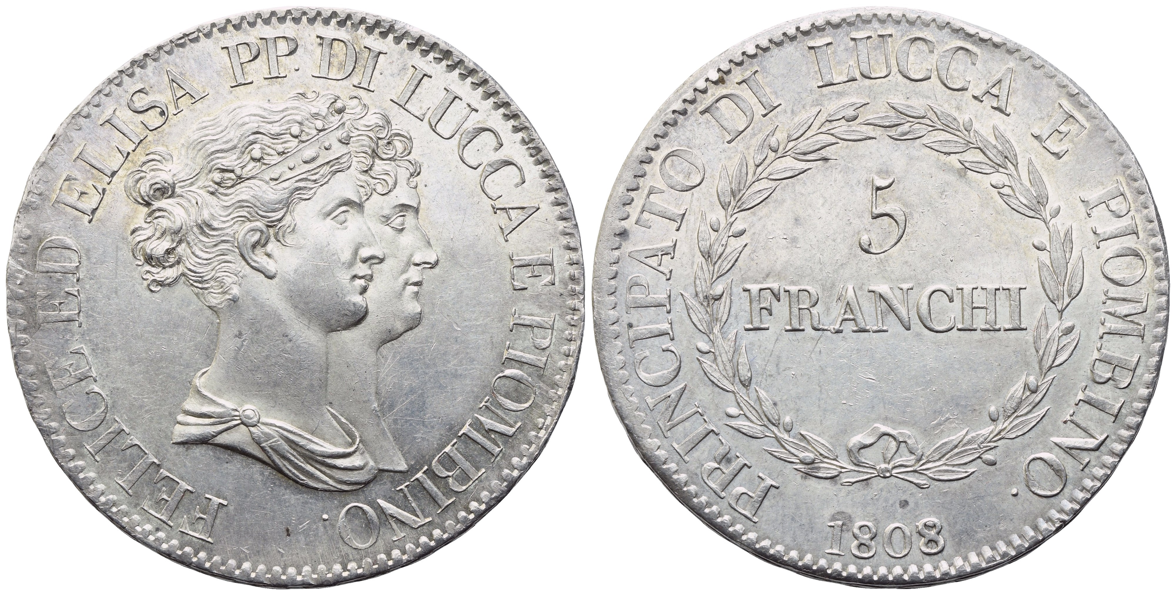 FELICE ED ELISA PP DI LUCCA E PIOMBINO Busti grandi accollati a destra. Rv. PRINCIPATO DI LUCCA E PIOMBINO Nel centro, 5 / FRANCHI entro rami di lauro legati in basso. Sotto, 1808 (seconda cifra 8 della data su 7). Pag. 254a; Mont. 439; MIR 244/4; Gig. 6. Rara. qFDC. Moneta eccezionale. Fondi lucenti.