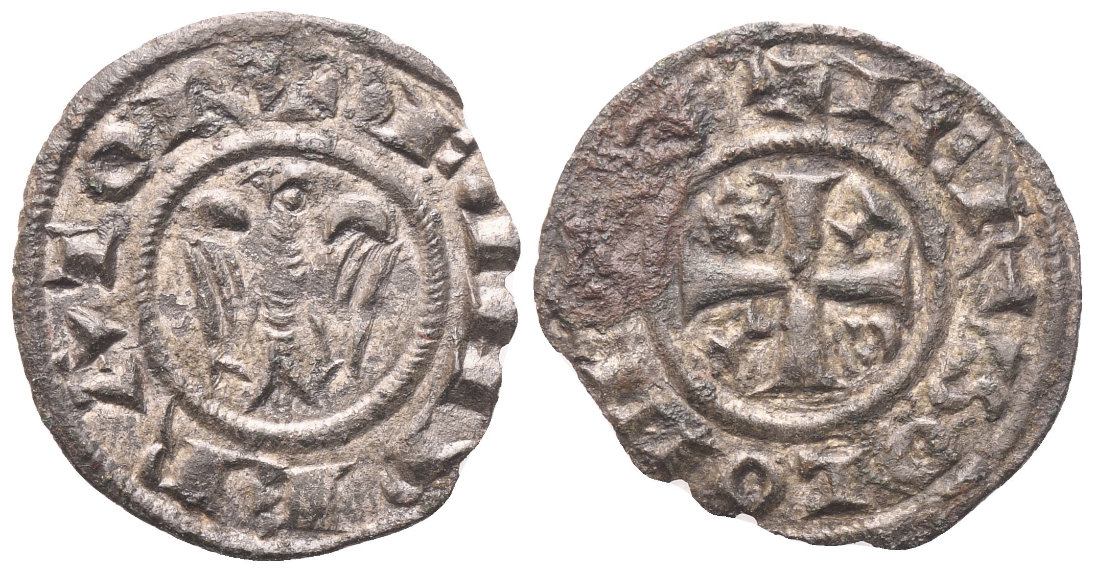 Coniato in seguito alle nozze con Isabella, figlia ereditaria di Giovanni di Brienne, 1225. Nel centro, aquila con testa volta a sinistra; nel giro "+. F. IMPERATOR ". Rv. Nel centro, croce patente con le lettere S – I – C – I negli angoli; nel giro "+ REX IERVSOLOMIT ". Spahr 115. Travaini 29. Molto raro. qSPL. Patina scura.