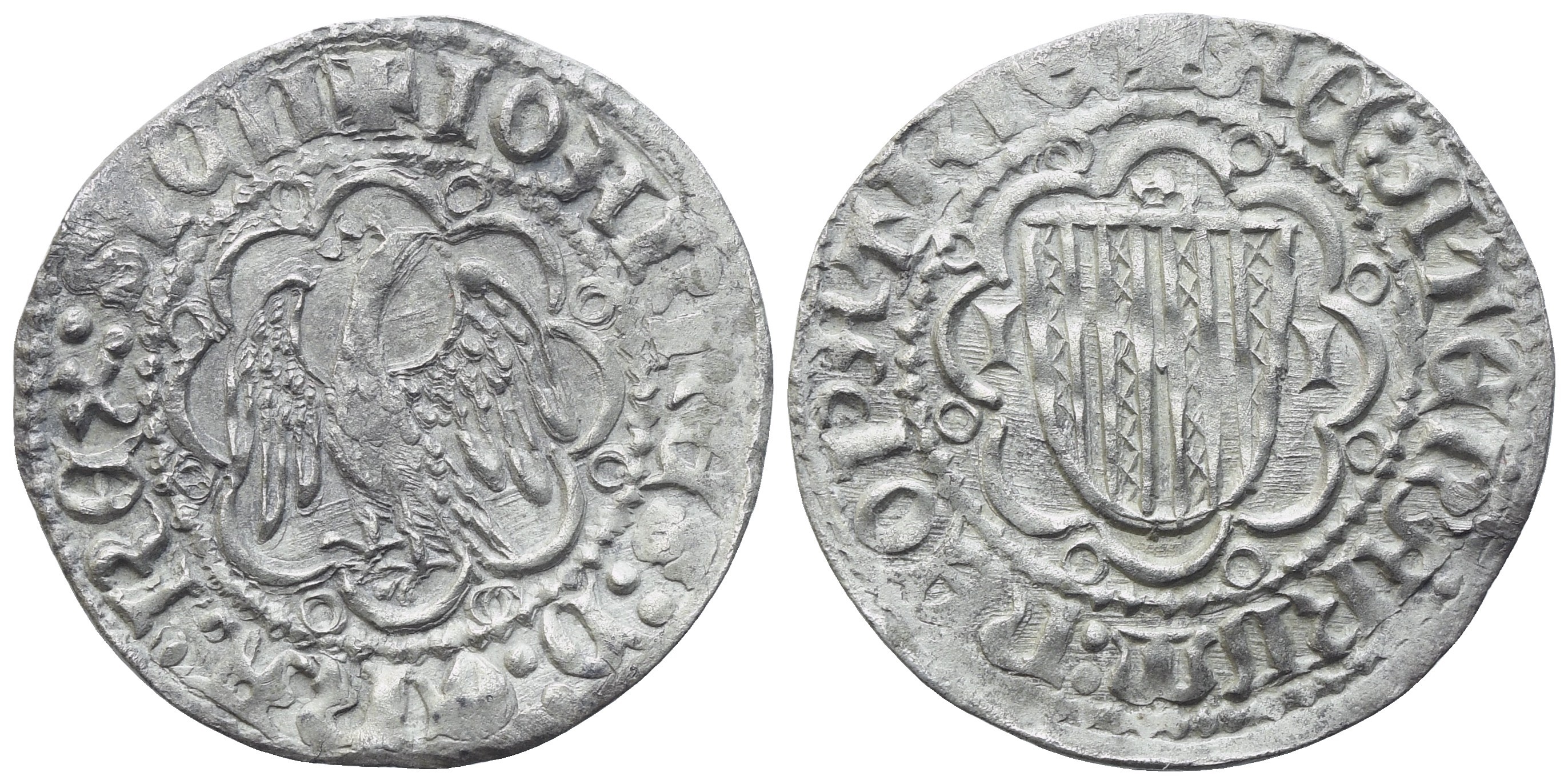 IOHANNES D GRA REX SICILI Aquila coronata ad ali spiegate, volta a destra. Rv. AC ATENARVM NEOPATRIE Stemma coronato, entro cornice d'archi; ai lati, I – I. Spahr 33. MIR 230/1. BB+