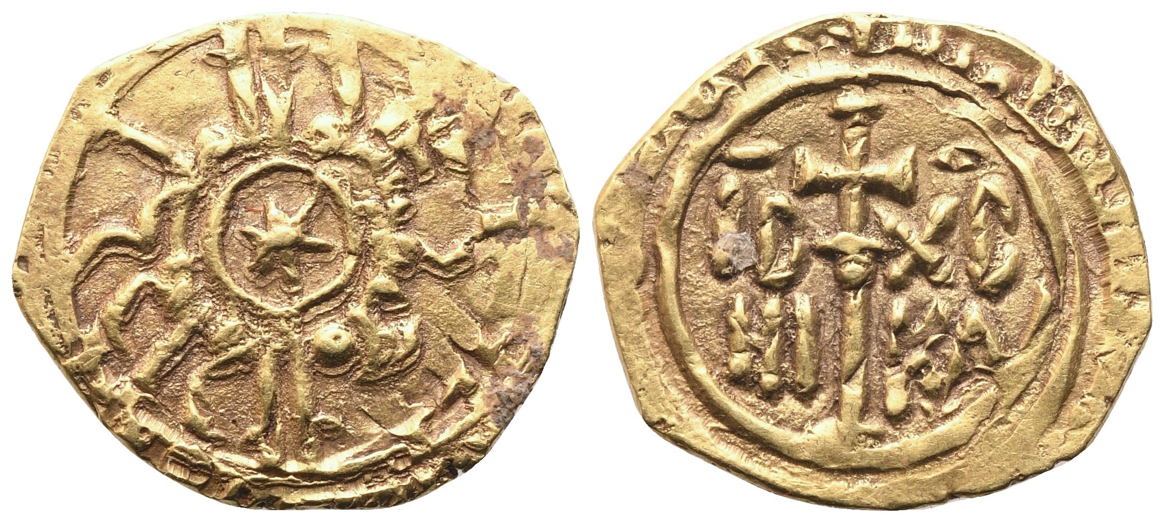In centro, stella a sei punte; attorno leggenda cufica. Rv. Croce astile entro legenda cufica; ai lati, IC – XC / NI – KA. D'Andrea 234; Travaini 219; Spahr 71. SPL