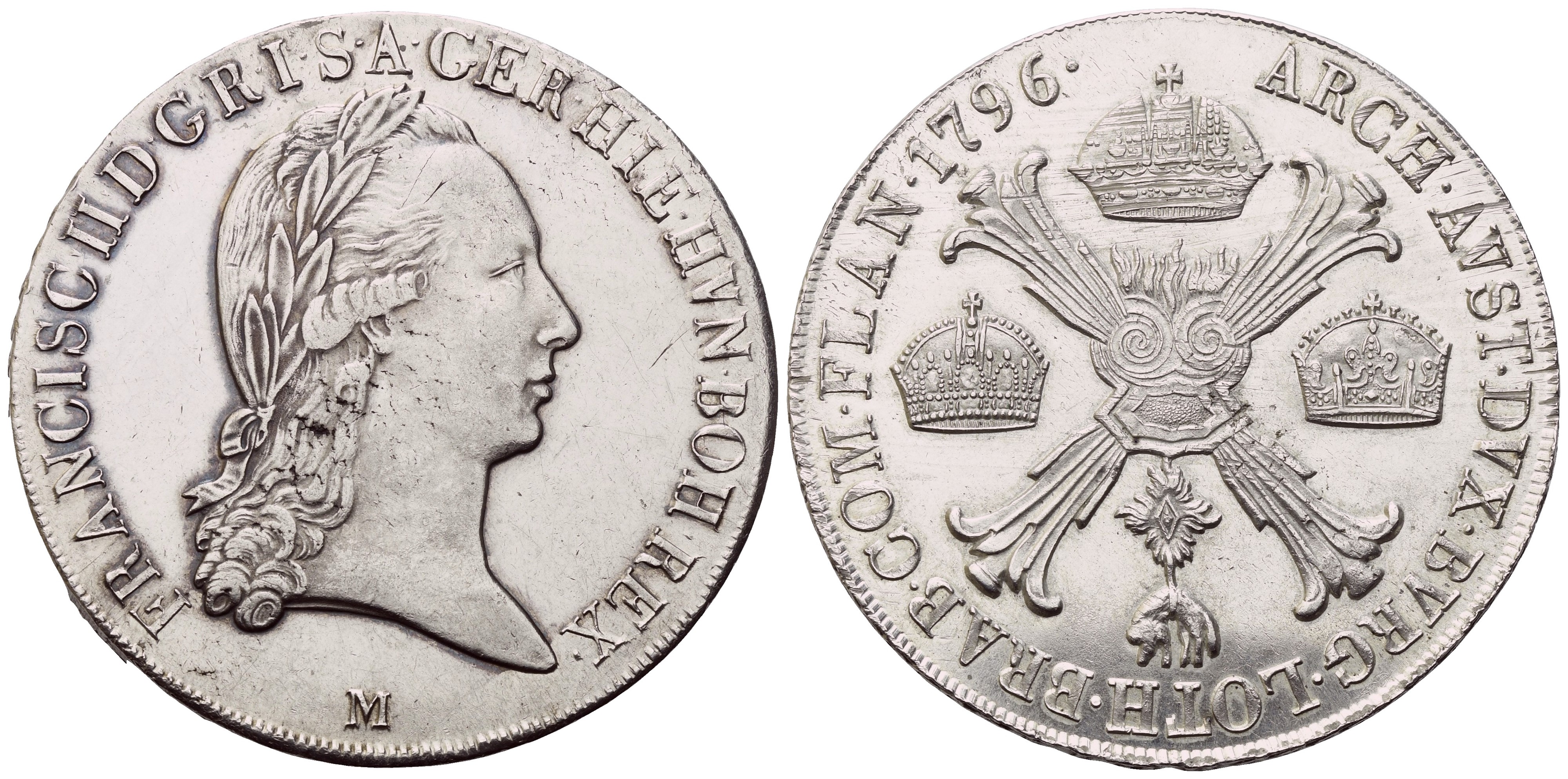 FRANCISC II D G R I S A GER HIE HVN BOH REX Testa laureata a destra; sotto il busto, M. Rv. ARCH AVST DVX BVRG LOTH BRAB COM FLAN 1796 Croce di Borgogna, col Toson d'oro, accantonata dalle corone d'Austria, Ungheria e Boemia. CNI 18; Cr. 7/e; Gig. 13; MIR 472/5. SPL+/qFDC. Fondi lucenti.