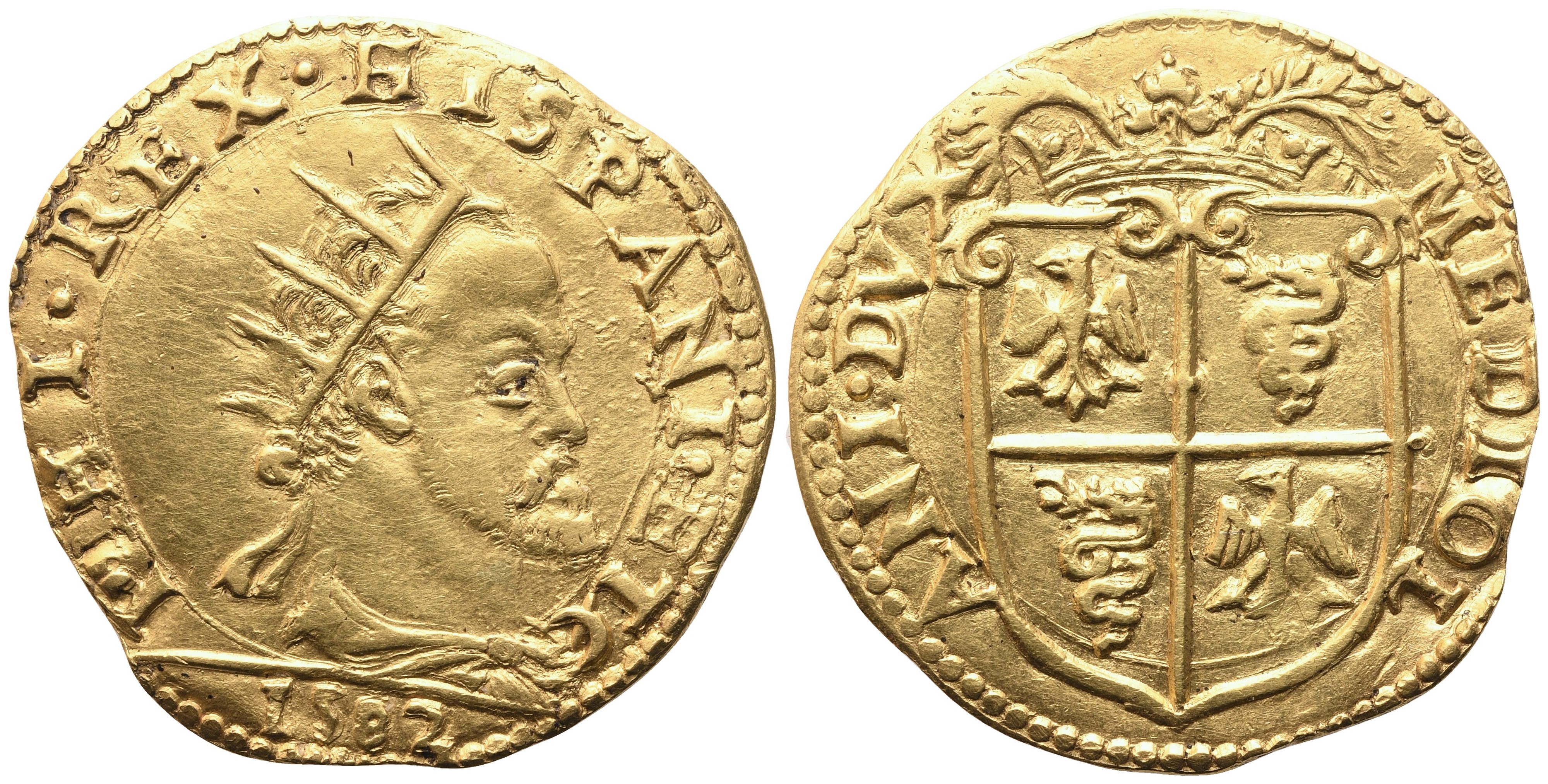 PHI REX HISPANI ETC Busto radiato e drappeggiato a destra.; all’esergo, 1582. Rv. MEDIOL - ANI DVX Stemma inquartato con l’aquila e la biscia, sormontato da corona da cui fuoriescono ramo di palma e di olivo. CNI 58. Crippa 4/B. Verri 404. Friedberg 716. Raro. SPL