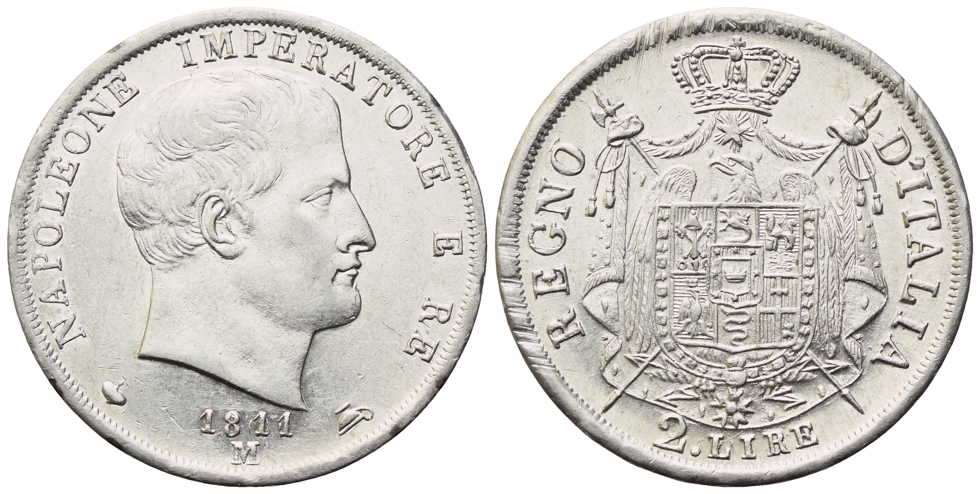 NAPOLEONE IMPERATORE E RE Testa nuda a destra; in basso, 1811 tra marchi di zecca. Rv. REGNO D'ITALIA Stemma coronato su padiglione sorretto da alabarde decussate con puntali aguzzi; in basso, 2 LIRE. Gig. 131a. SPL+/qFDC. Minimi graffietti marginali di conio al rovescio. Conservazione insolita.