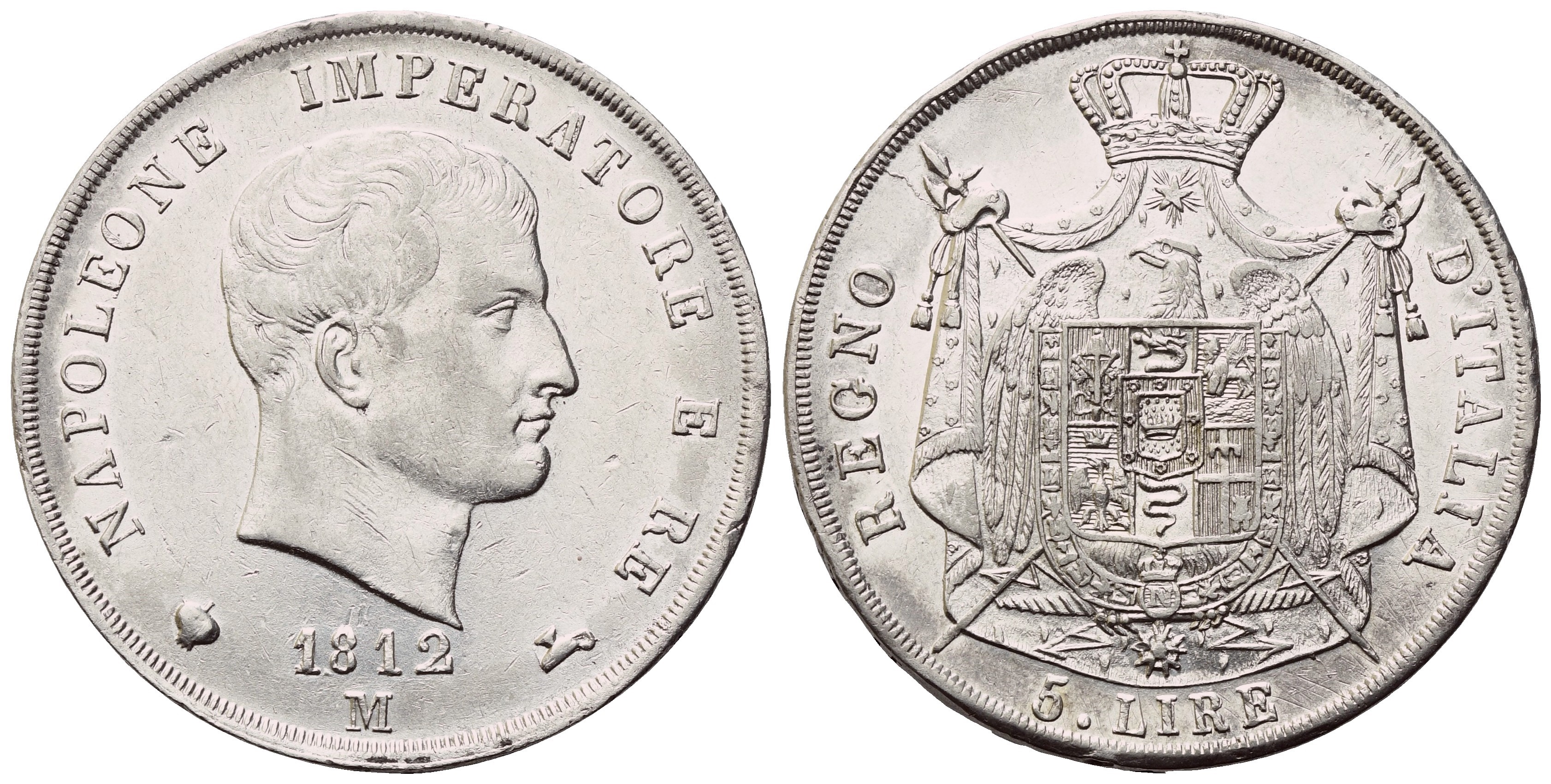 NAPOLEONE IMPERATORE E RE Test nuda a destra; in basso, 1812 tra marchi di zecca. Rv. REGNO D'ITALIA Stemma coronato su padiglione sorretto da alabarde decussate con puntali aguzzi; in basso, 5 LIRE. Pag. 30 var. (A senza barretta orizzontale al D/); Gig. 112a. SPL+/qFDC. Fondi lucenti.