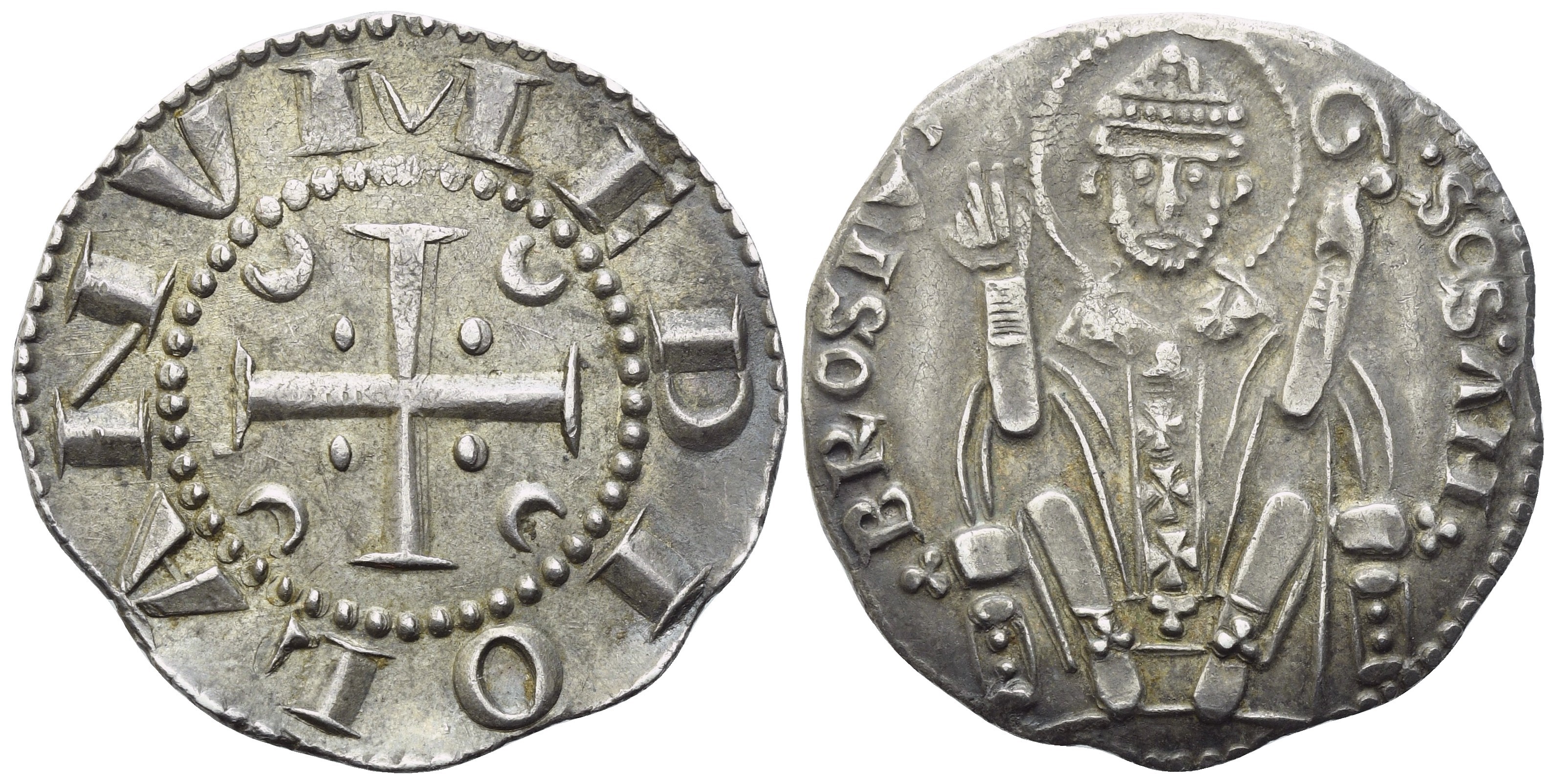 MEDIOLANV Croce potenziata; agli angoli, quattro crescenti e quattro globetti. Rv. SAS AMBROSIV Sant'Ambrogio, frontale e seduto su trono decorato da trifogli, regge pastorale e solleva la d. per benedire. CNI 17/19; Crippa 24; Biaggi 1245; MIR 66/4. R2. SPL+/qFDC