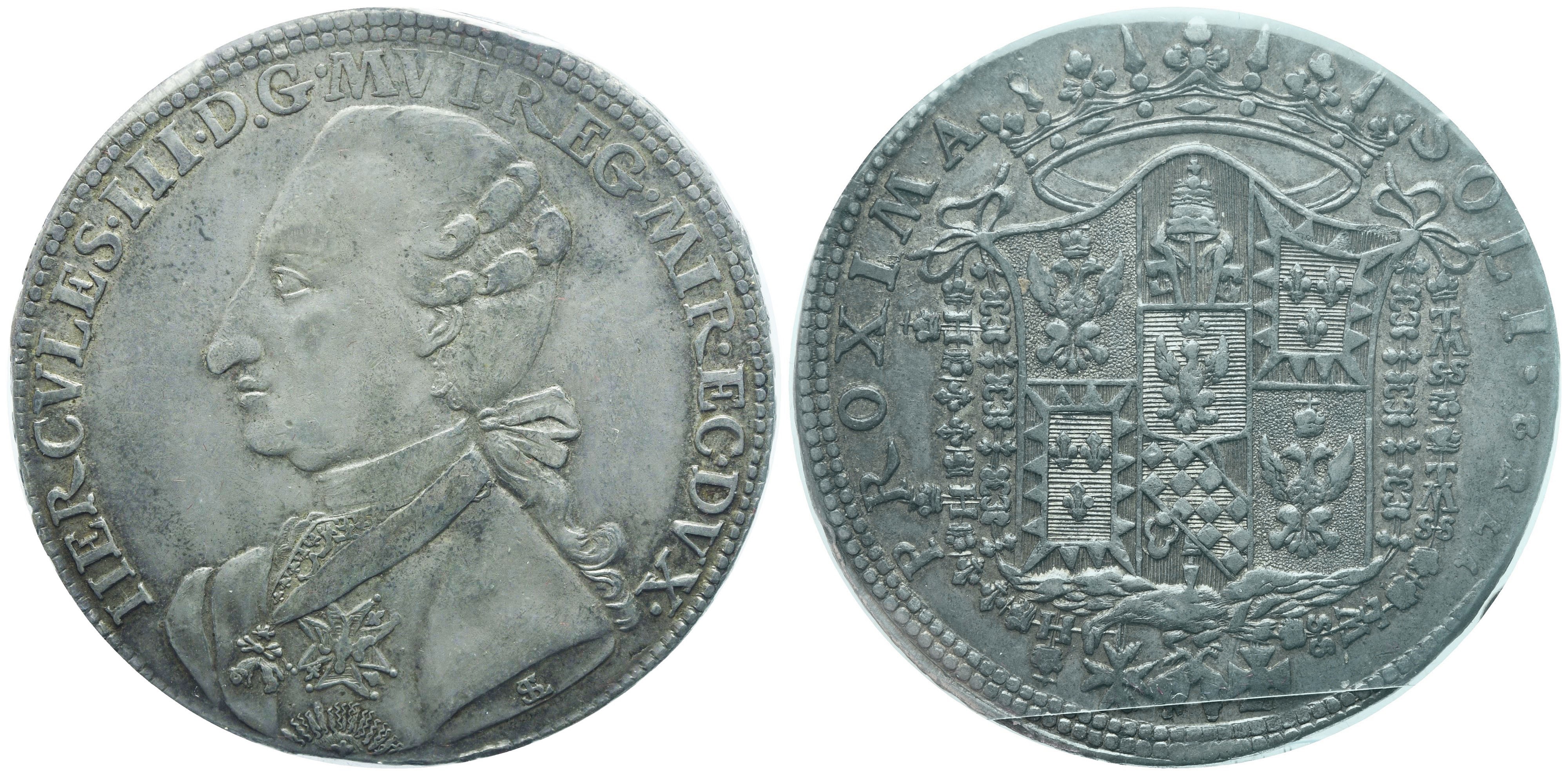 HERCVLES III D•G•MVT•REG•MIR•EC•DVX Busto vestito a sinistra; nel troncato, LS. Rv. scudo estense coronato compreso in collare con ordini cavallereschi. Contorno (ornatino) MISURAM (ornatino) ET (ornatino) PRETIVM (ornatino) (B) . MIR 857/1, CNI 2, Ravegnani M. 3. Rara. Periziata G. Erpini. SPL+