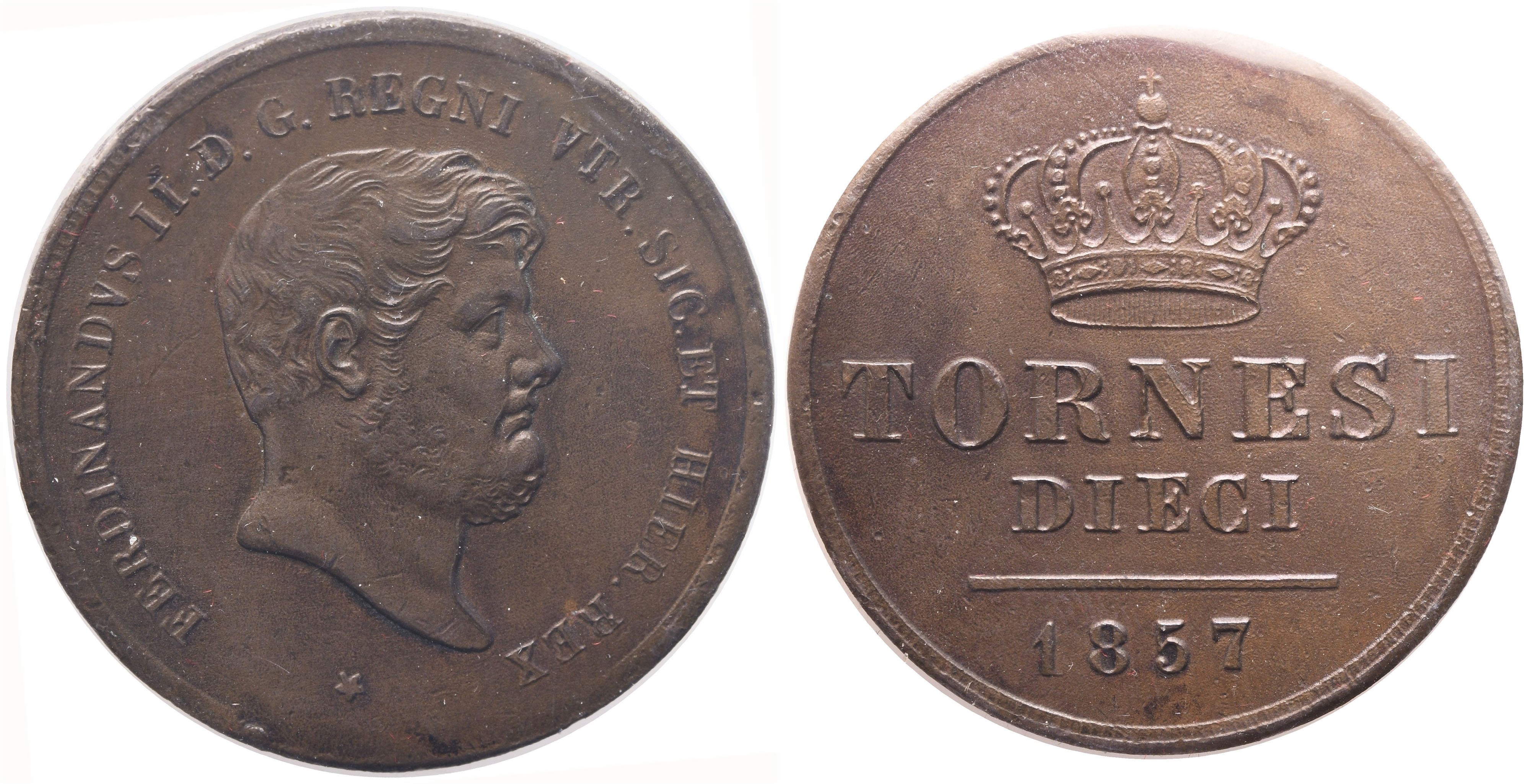 FERDINANDVS II D G REGNI VTR SIC ET HIER REX * Testa nuda a destra. Rv. Corona reale / TORNESI / DIECI / 1857. Gig. 208. Non comune. Periziata Antonio Rennella. SPL.