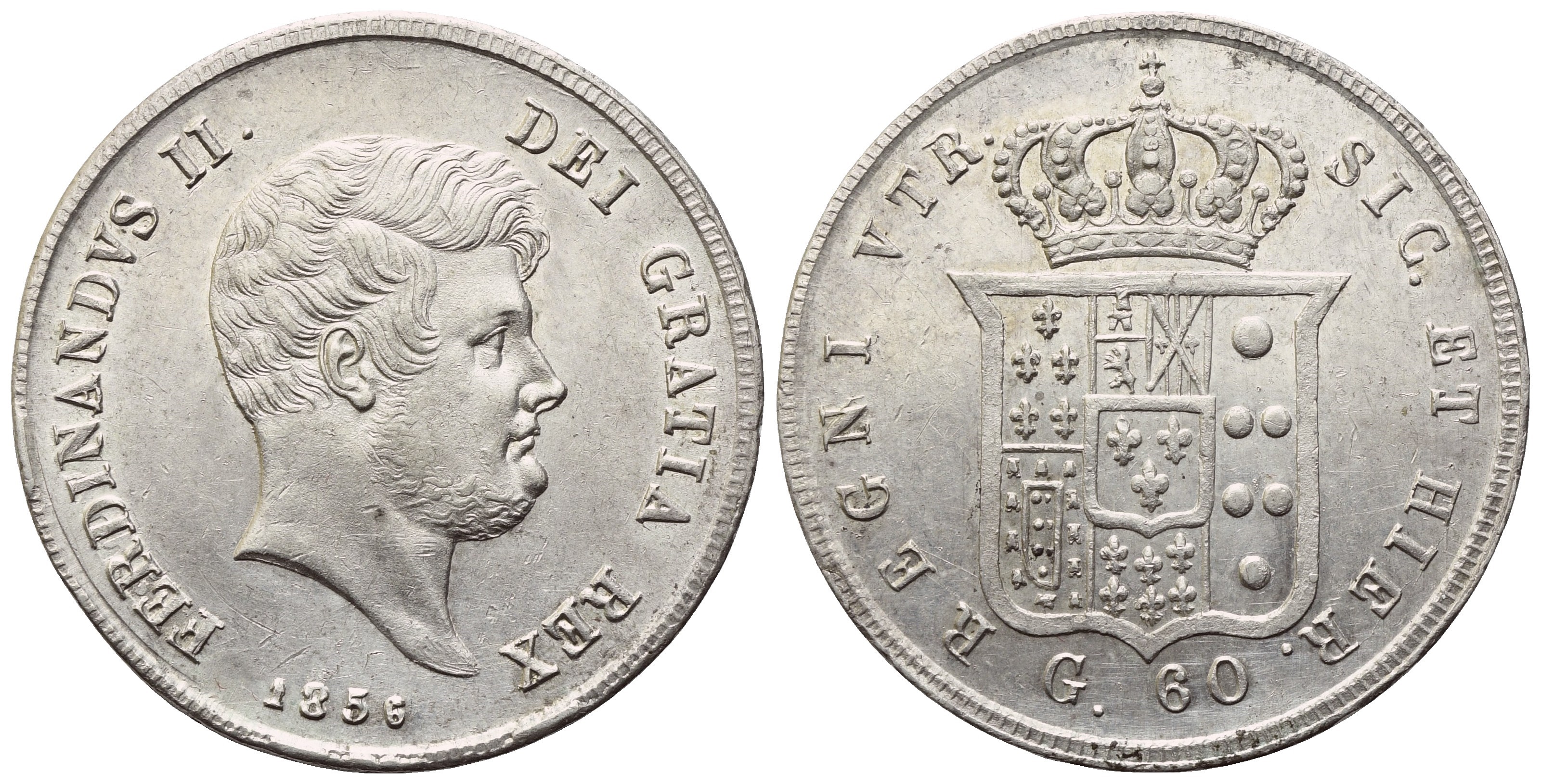 FERDINANDVS II DEI GRATIA REX Testa nuda e barbuta a sinistra; in basso, 1856. Rv. REGNI VTR SIC ET HIER Stemma coronato; in basso, G. 60. Gig. 112. qFDC. Fondi lucenti.