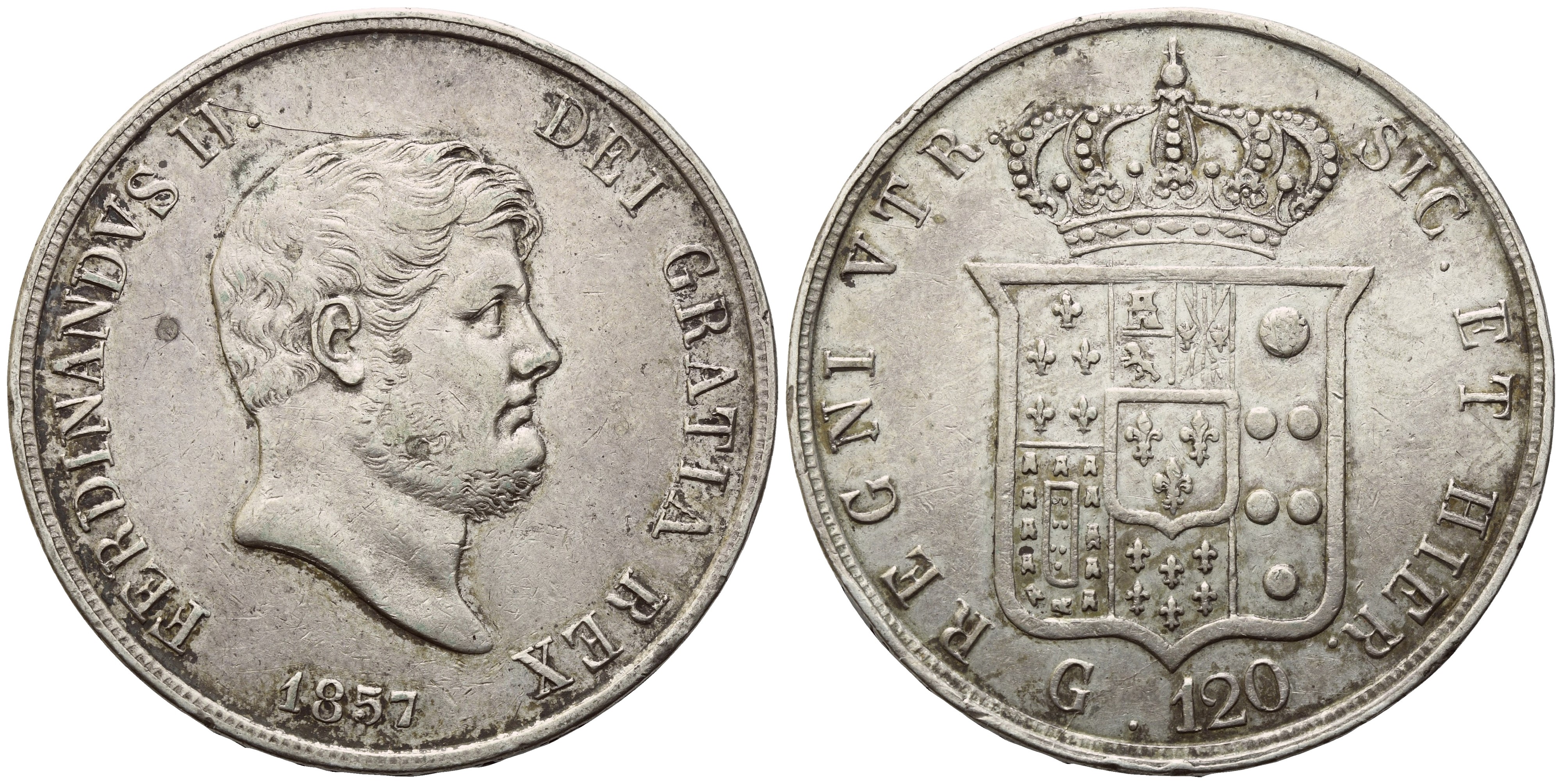 FERDINANDVS II DEI GRATIA REX Testa nuda, adulta, piccola e con barba; in basso, 1857. Rv. REGNI VTR SIC ET HIER Stemma coronato; in basso, G 120. Gig. 88. qSPL