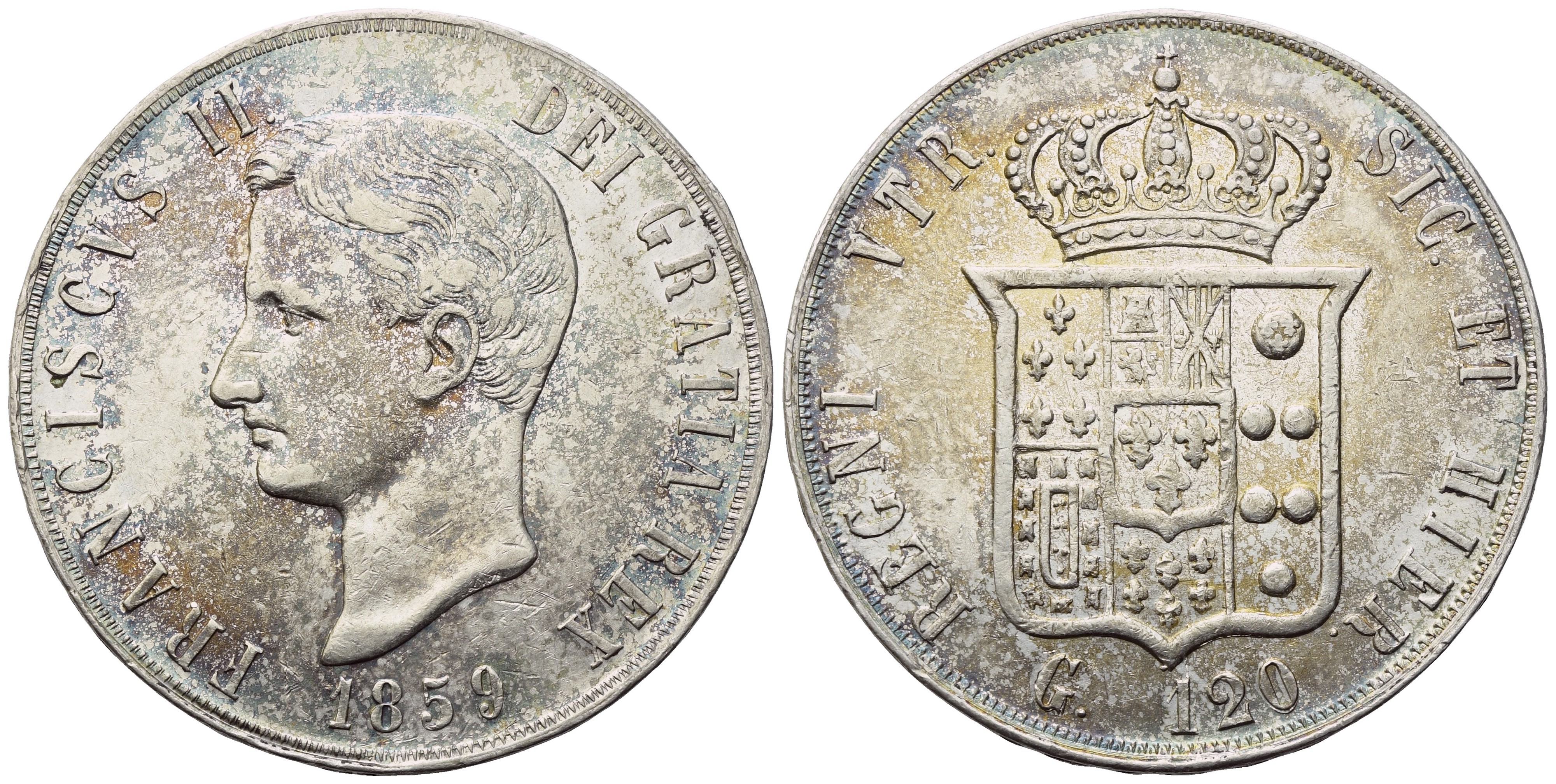 FRANCISCVS II DEI GRATIA REX 1859 Testa nuda a sinistra; nel taglio del collo, L.A. in corsivo (Luigi Arnaud, incisore). Rv. REGNI VTR SIC ET HIER Stemma coronato; in basso, G 120. Gig. 1. SPL.