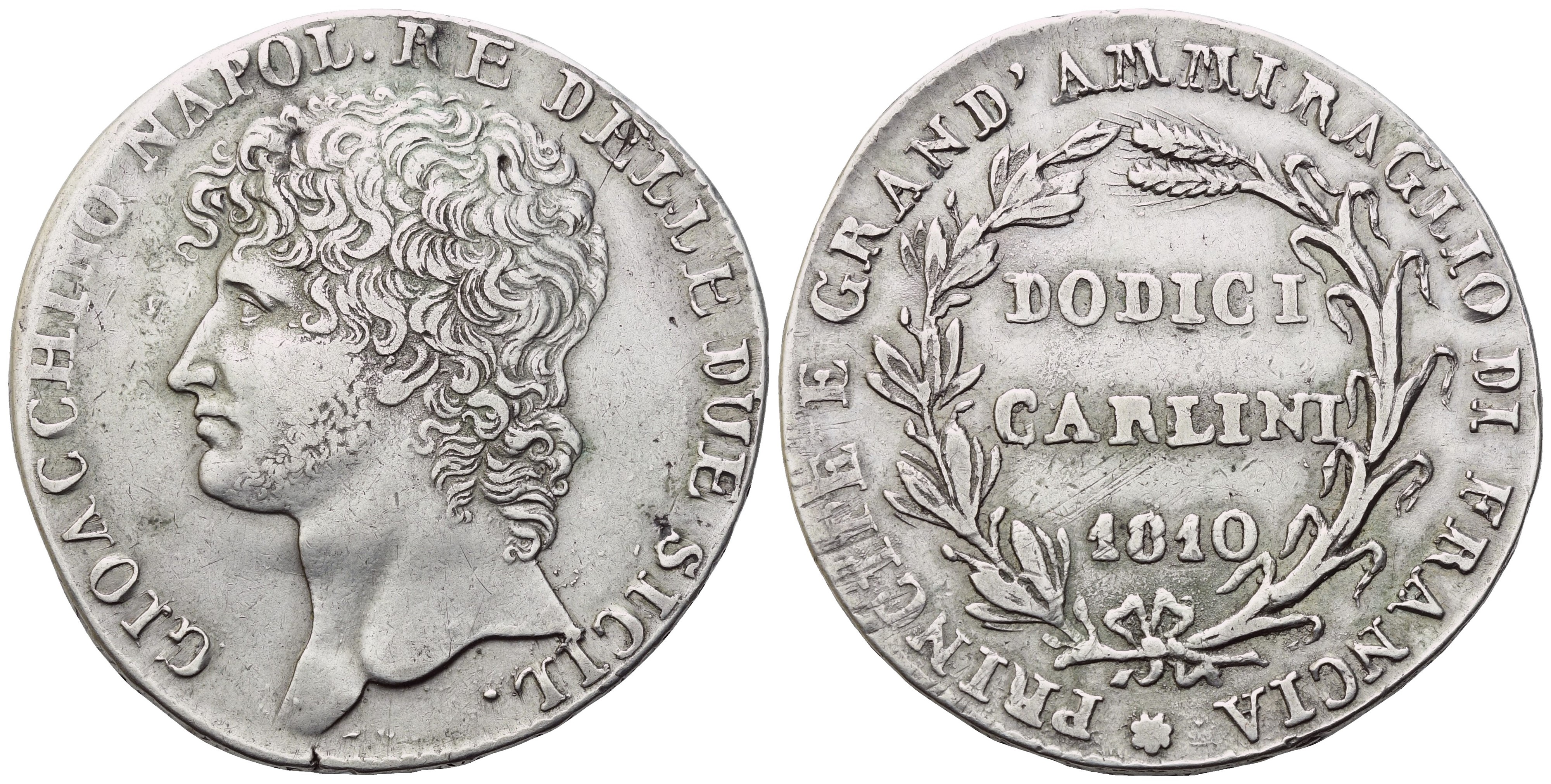 GIOACCHINO NAPOL RE DELLE DUE SICIL Testa nuda a sinistra. Rv. PRINCIPE E GRAND'AMMIRAGLIO DI FRANCIA Nel centro, DODICI /CARLINI / 1810 entro ramo d'ulivo e stelo di grano con spighe, legati in basso con fiocco. Contorno: tra stelle in rilievo, DIO PROTEGGE IL RE E IL REGNO. Gig. 2c. Rara. BB/BB+. Minimi graffi al rovescio; qualche colpetto sul bordo.