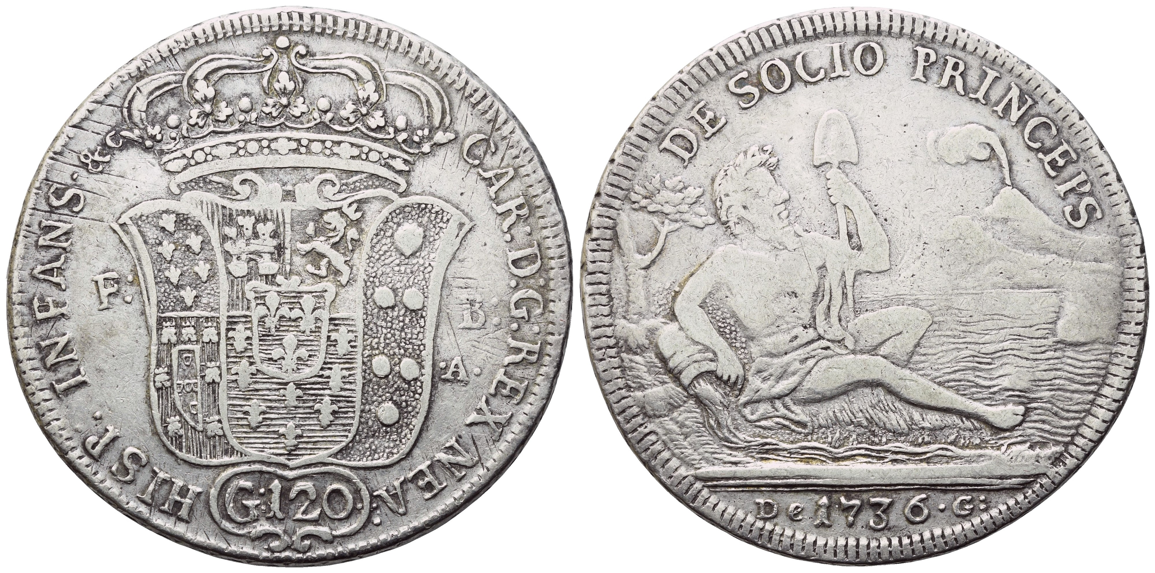 CARD D G REX NEA HISP INFANS & C Stemma coronato tra F – B (Francesco Maria Berio, maestro di zecca) / A (Francesco Antonio Ariani, maestro di prova); in basso, G 120 entro cornice. Rv. DE SOCIO PRINCEPS Sebeto sdraiato; sullo sfondo, il Vesuvio; in esergo, data tra De – G (Giovanni Casimiro De Gennaro, incisore). Pannuti Riccio 24; MIR 334/3; Gig. 24. Raro. BB