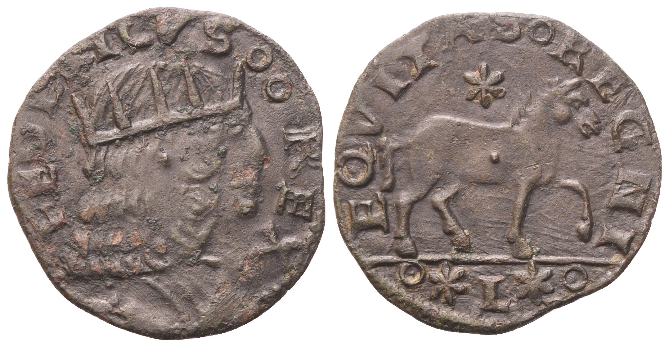 FEDERICVS °° REX Busto con corona radiata a destra. Rv. EQVITAS ° REGNI Cavallo a destra, zampa alzata; sorpa, stella; in esergo, °*L*°. Pannuti-Riccio 14; MIR 110. Raro. qSPL. Gradevole patina marrone.