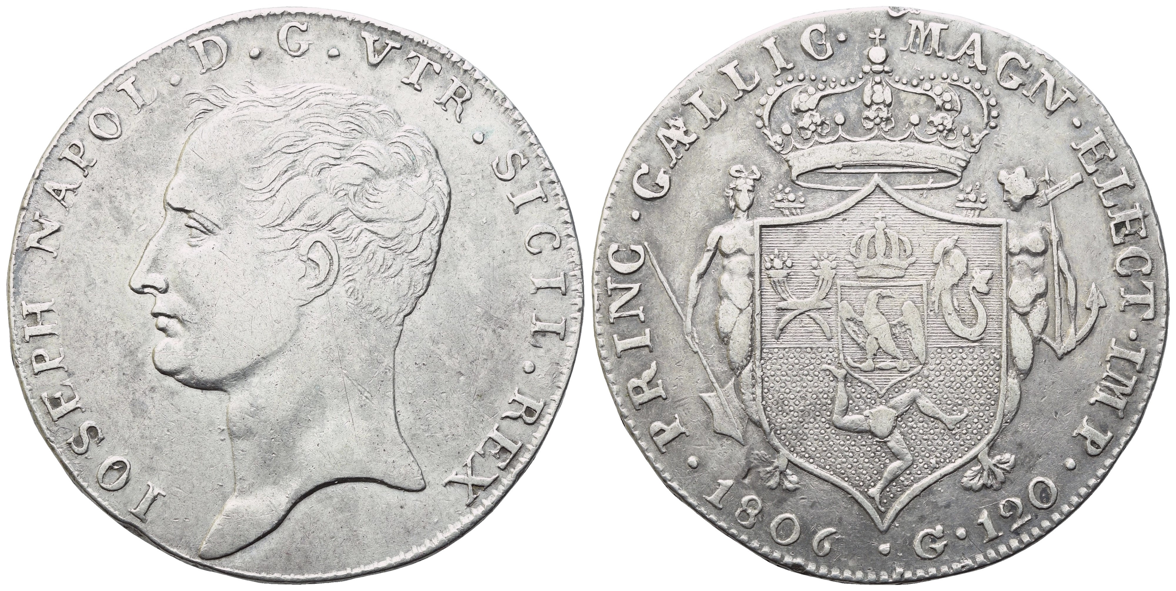 IOSEPH NAPOL D G VTR SICIL REX Testa nuda a sinistra. Rv. PRINC GALLIC MAGN ELECT IMP Stemma coronato tra due sirene. In basso a sinistra, 1806; a destra, G 120. Gig. 1. MIR 433. Pannuti-Riccio 1. Molto rara. BB+