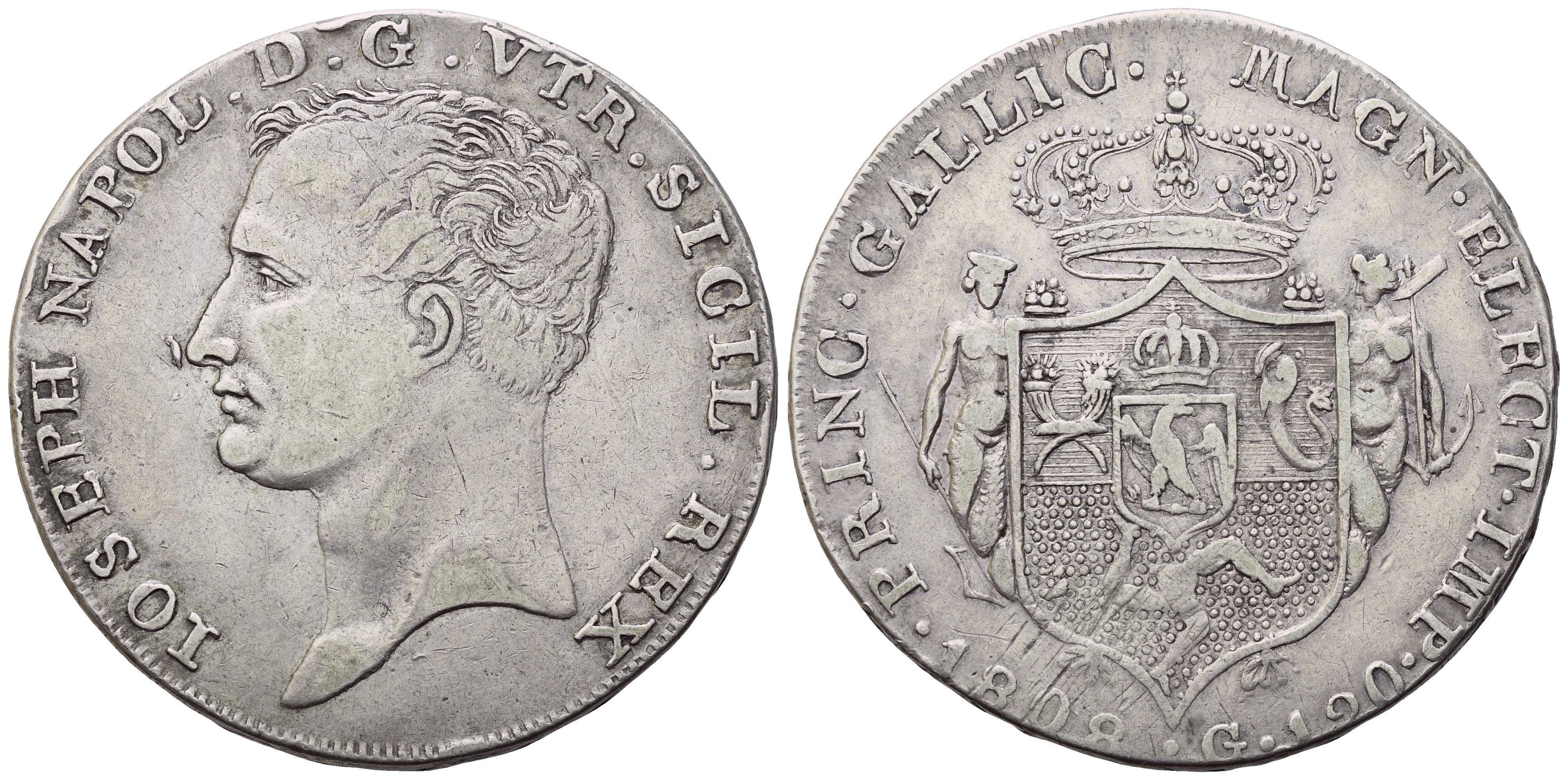 IOSEPH NAPOL D G VTR SICIL REX Testa nuda a sinistra. Rv. PRINC GALLIC MAGN ELECT IMP 1808 G 120 Stemma coronato tra due sirene. Gig. 3; Pannuti-Riccio 3; Mont. 408; Pag. 43. Rara. BB+