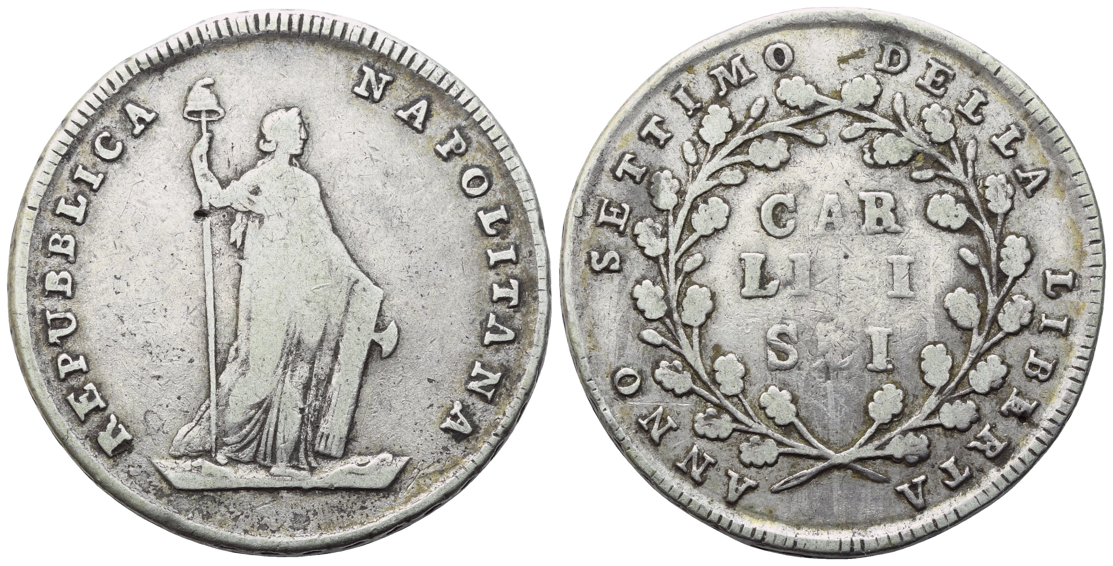 REPUBBLICA NAPOLITANA La Libertà, volta a destra, tiene il fascio e l'asta sormontata dal pileo. Rv. ANNO SETTIMO DELLA LIBERTA Nel centro, CAR / LINI / SEI tra due rami di quercia. Pannuti-Riccio 2; Pag. 2; MIR 414; Gig. 2. R2. MB/BB