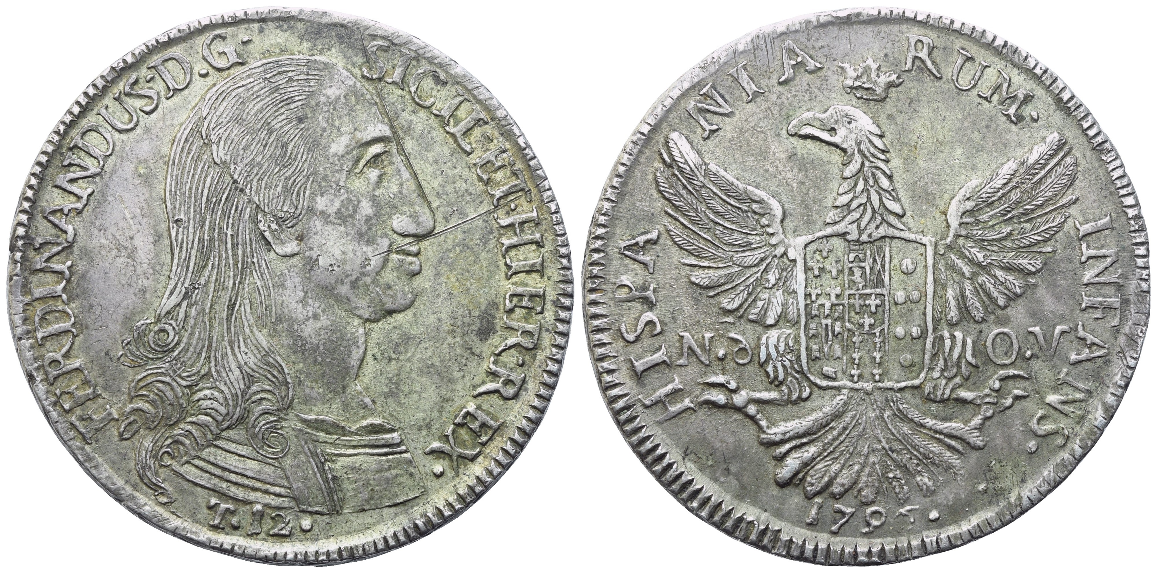 FERDINANDVS D G SICIL ET HIER REX Semibusto corazzato a destra; sotto il busto, T 12. Rv HISPA – NIA – RUM – INFANS Aquila coronata ad ali spiegate, inquartata da stemma, ra N δ – O V. In basso, 1796. Gig. 16b. SPL. Graffio al dritto. Splendido esemplare corredato da una patina di vecchia collezione.