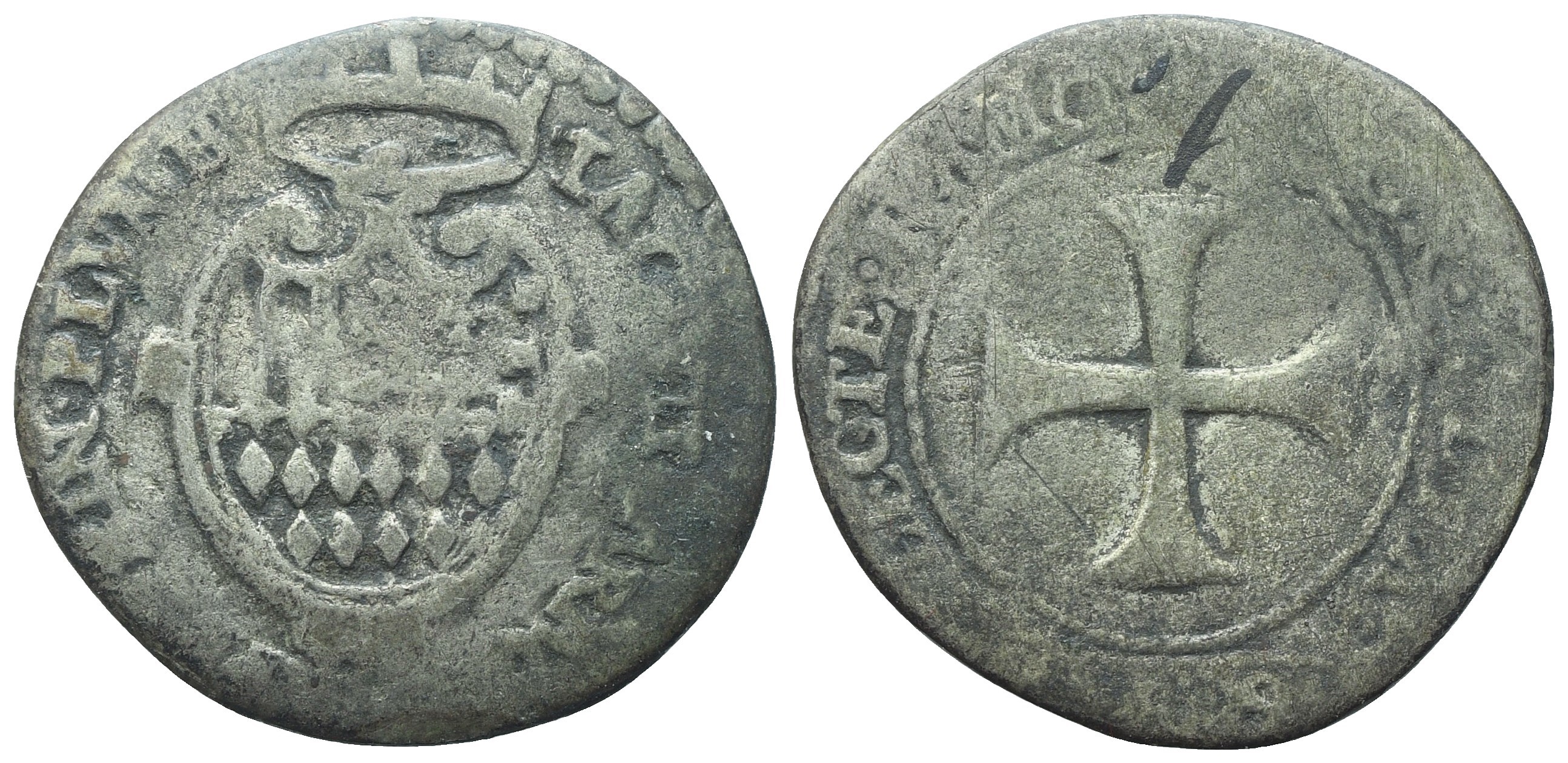 Stemma coronato di Aragona e Appiani. Rv. Croce patente. MIR 361. Giannoni 3a o 3d (R2). Molto raro, MB/BB.