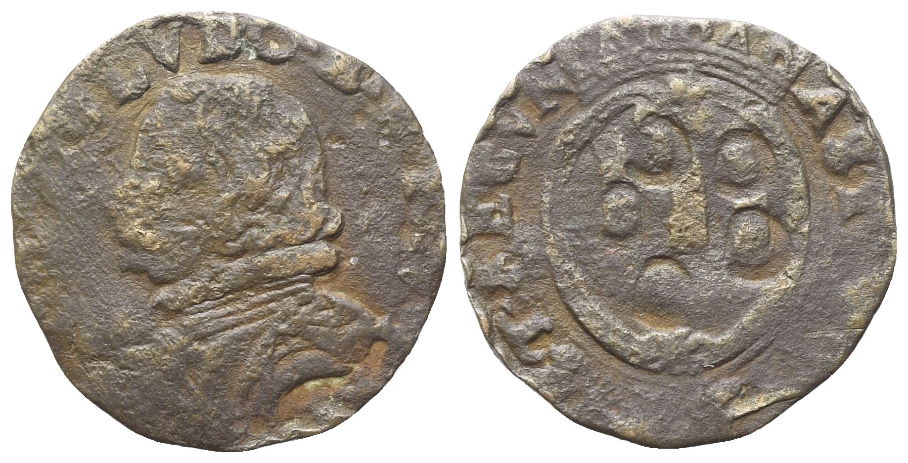 Busto corazzato a paludato a sx. Rv. Stemma Ludovisi coronato. MIR 370. Cfr. Giannoni 52-55. Ribattuto su un quattrino di Firenze, qBB.