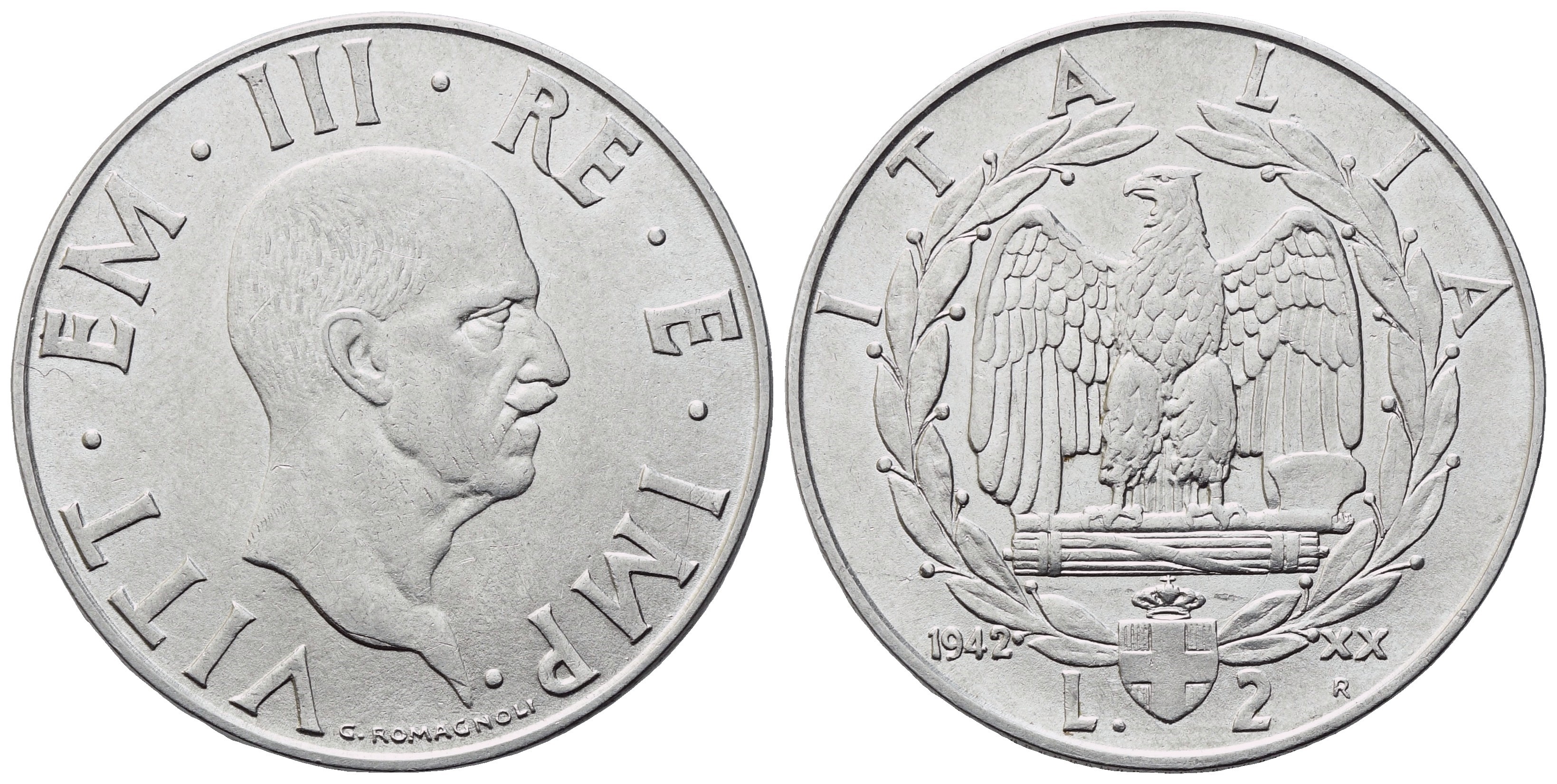 VITT EM III RE E IMP Testa nuda a destra; in basso, G ROMAGNOLI. Rv. I T A L I A Aquila ad ali spiegate su fascio littorio tra due rami di lauro, uniti da stemma crociato e coronato; a sinistra, 1942; a destra, XX / R. In basso, L 2. Gig. 123; Pag. 761. Molto rara. SPL+/qFDC