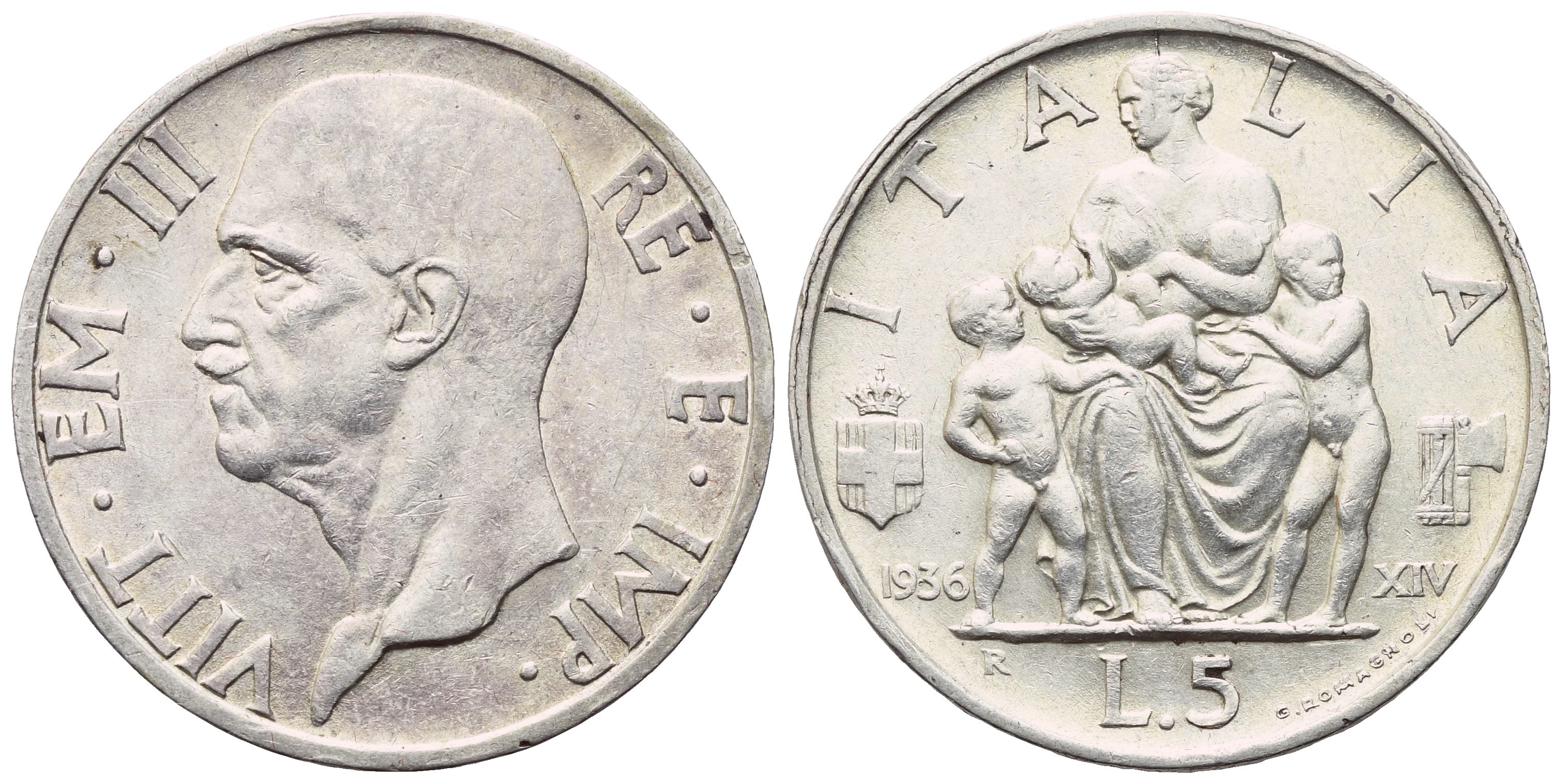 VITT EM III RE E IMP Testa nuda a sinistra. Rv. I T – A – L I A L'Italia seduta, attorniata dai suoi figli, tra scudo crociato coronato e fascio littorio. Sotto lo scudo, 1936; sotto il fascio, XIV. In esergo, L 5 – G ROMAGNOLI. Gig. 83. qFDC. Fondi lucenti. Impercettibili colpetti sui bordi.