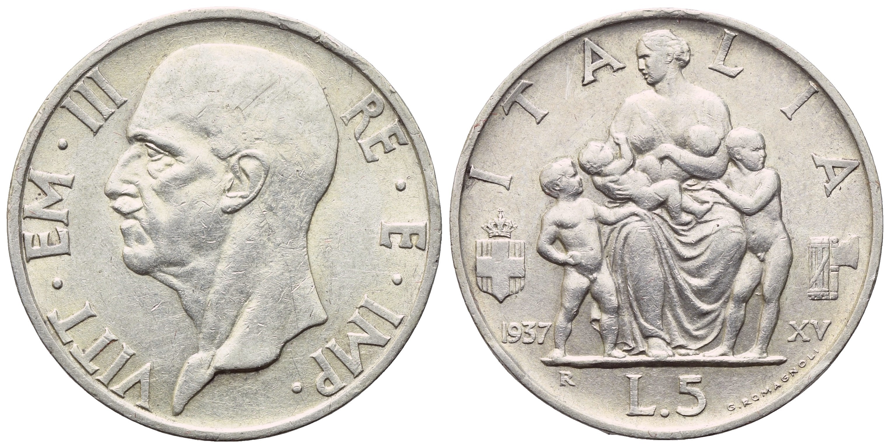 VITT EM III RE E IMP Testa nuda a sinistra. Rv. I T – A – L I A L'Italia seduta, attorniata dai suoi figli, tra scudo crociato coronato e fascio littorio. Sotto lo scudo, 1937; sotto il fascio, XV. In esergo, L 5 – G ROMAGNOLI. Gig. 84. Rara. qFDC. Impercettibili colpetti sui bordi.