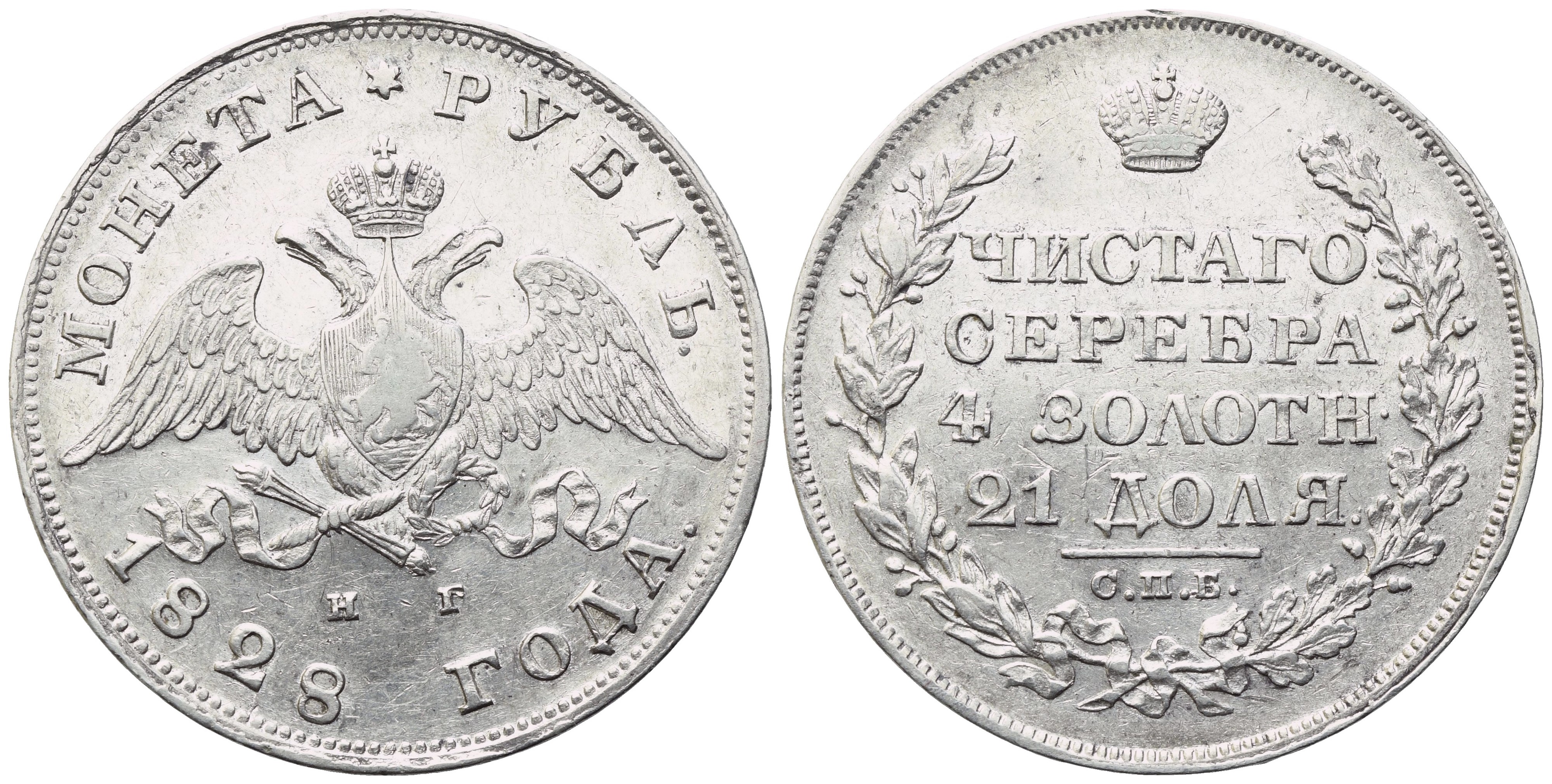 Zecca: San Pietroburgo. МОНЕТА * РУБЛЬ. / Н Г / 1828 ГОДА Aquila bicipite coronata. Rv. ЧИСТАГО / СЕРЕБРА / 4 ЗОЛОТН∙/21 ДОЛЯ. / С.П.Б. entro ghirlanda formata da un ramo d'ulivo e uno di quercia. In alto, corona. KM-C# 161; Bitkin 106. SPL