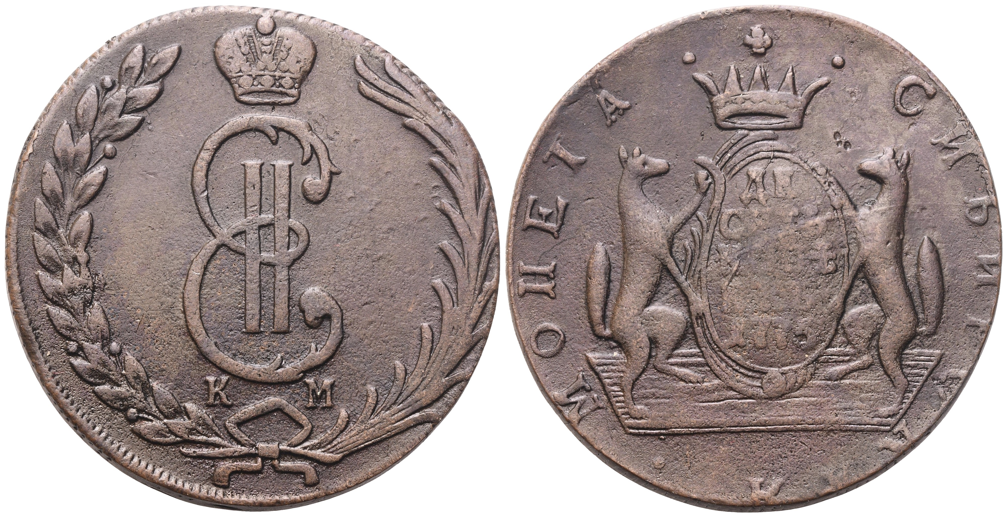 Monogramma coronato entro un ramo d'alloro e uno di palma. Rv. CИБИPCKAЯ MONETA Scudo coronato sorretto da due zibellini e inscritto ДЕ/СЯТЬ/КОПѢ/ЕКЪ/1775; in alto, croce. Brekke 517; Bitkin 1033. BB+