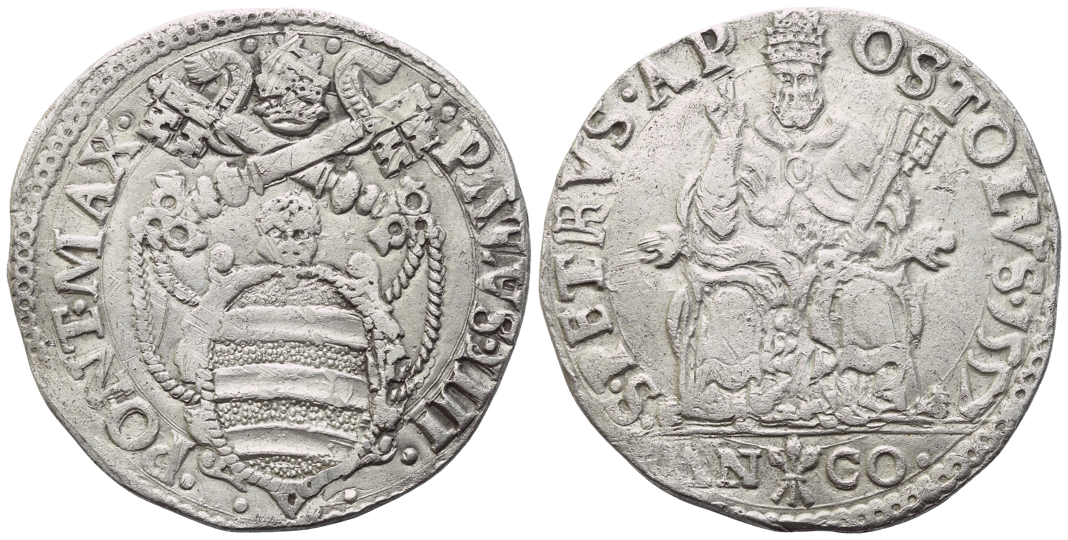 PAVLVS III PONT MAX Scudo sormontato da triregno e chiavi decussate. Rv. S PETRVS APO – OSTOLVS 1557. San Pietro in abito pontificale seduto di fronte nell'atto di benedire. In esergo, AN – CO. CNI 25 var. (legenda dritto). BB+