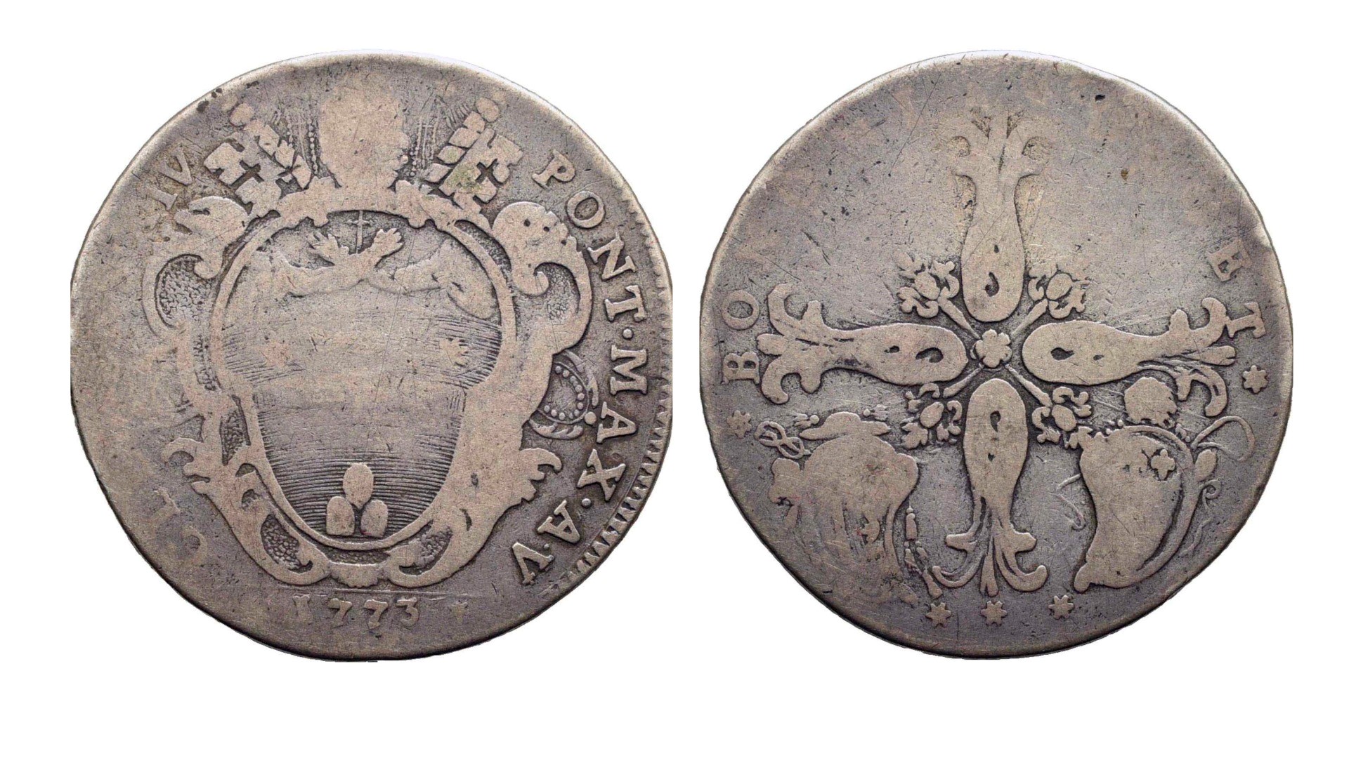 CLE[MENS] XIV – PONT MAX A V Stemma sormontato da triregno e chiavi decussate; sotto, 1773 / [M P] (Matteo Pignoni, zecchiere). Rv. BONONIA DOCET Croce gigliata; in basso, ai lati, armette del legato Branciforte e della Città. Muntoni 15 var I. Berman 2940. MIR 2745/4  CNI 13. RRRR. MB.