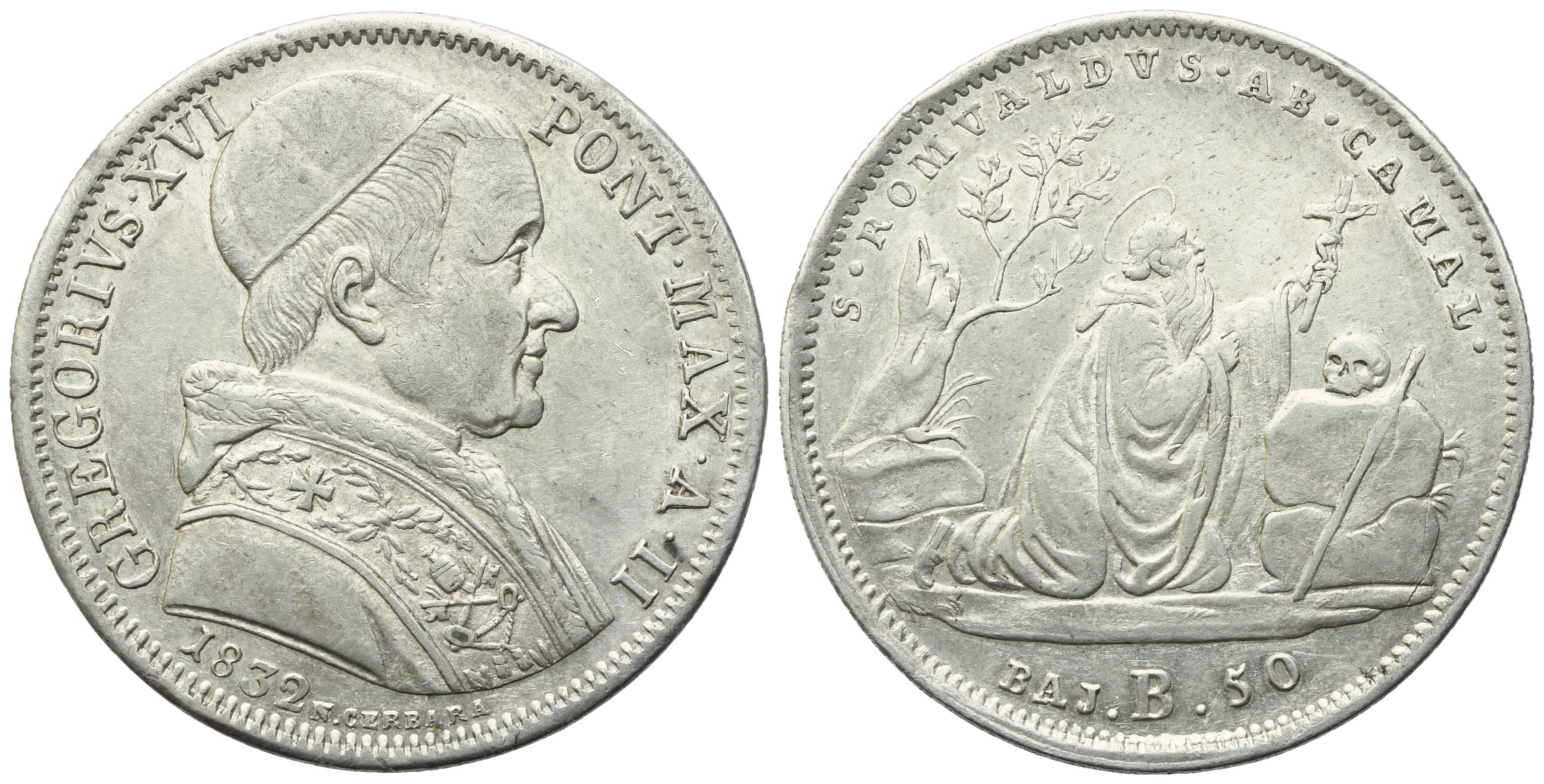 GREGORIVS XVI PONT MAX A II Busto a destra con zucchetto, mozzetta e stola; in basso, 1832 N. CERBARA. Rv. S ROMVALDVS AB CAMAL San Romualdo genuflesso con Crocifisso, tra albero d'ulivo e roccia; in esergo, BAJ – B – 50. Gig. 53. SPL