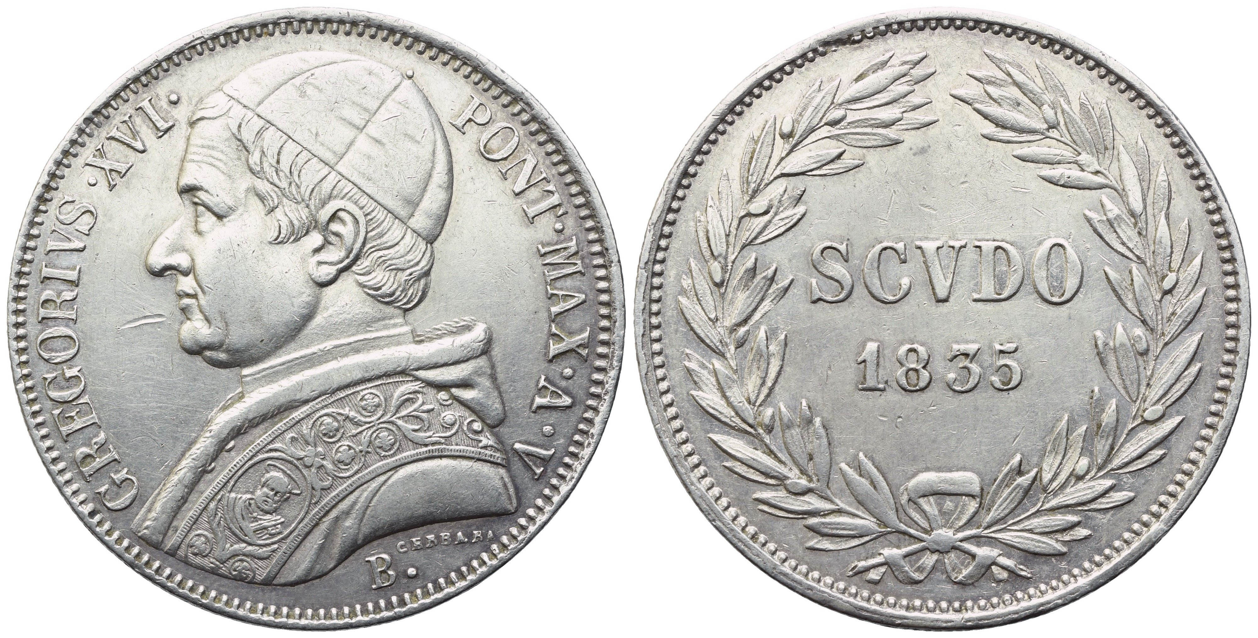 GREGORIVS XVI PONT MAX A V Busto a sinistra con mozzetta e stola; sotto nel giro in caratteri minuti, CERBARA; sotto, B. Rv. SCVDO / 1835 , tra due rami di olivo ascendenti e legati alla base con fiocco. CNI 13. Muntoni 27. Pagani 155. Serafini 49. ST 236 (C). Raro. BB+. Graffietto nel campo.