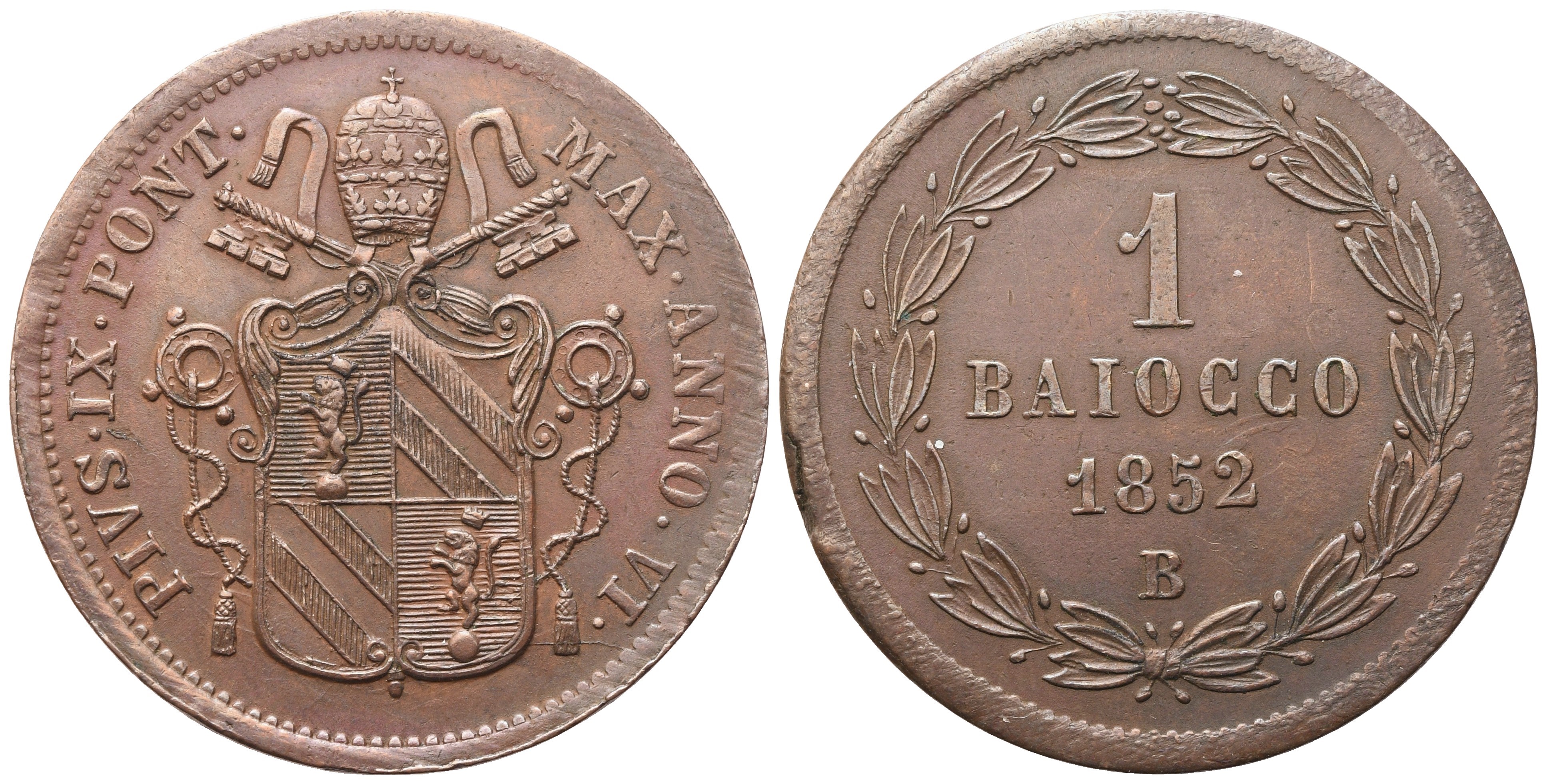 PIVS IX PONT MAX ANNO VI Stemma sormontato da triregno e chiavi decussate. Rv. 1 / BAIOCCO / 1852 / B entro corona di lauro chiusa in alto. Gig. 233. Raro. SPL+. Patina rossiccia.