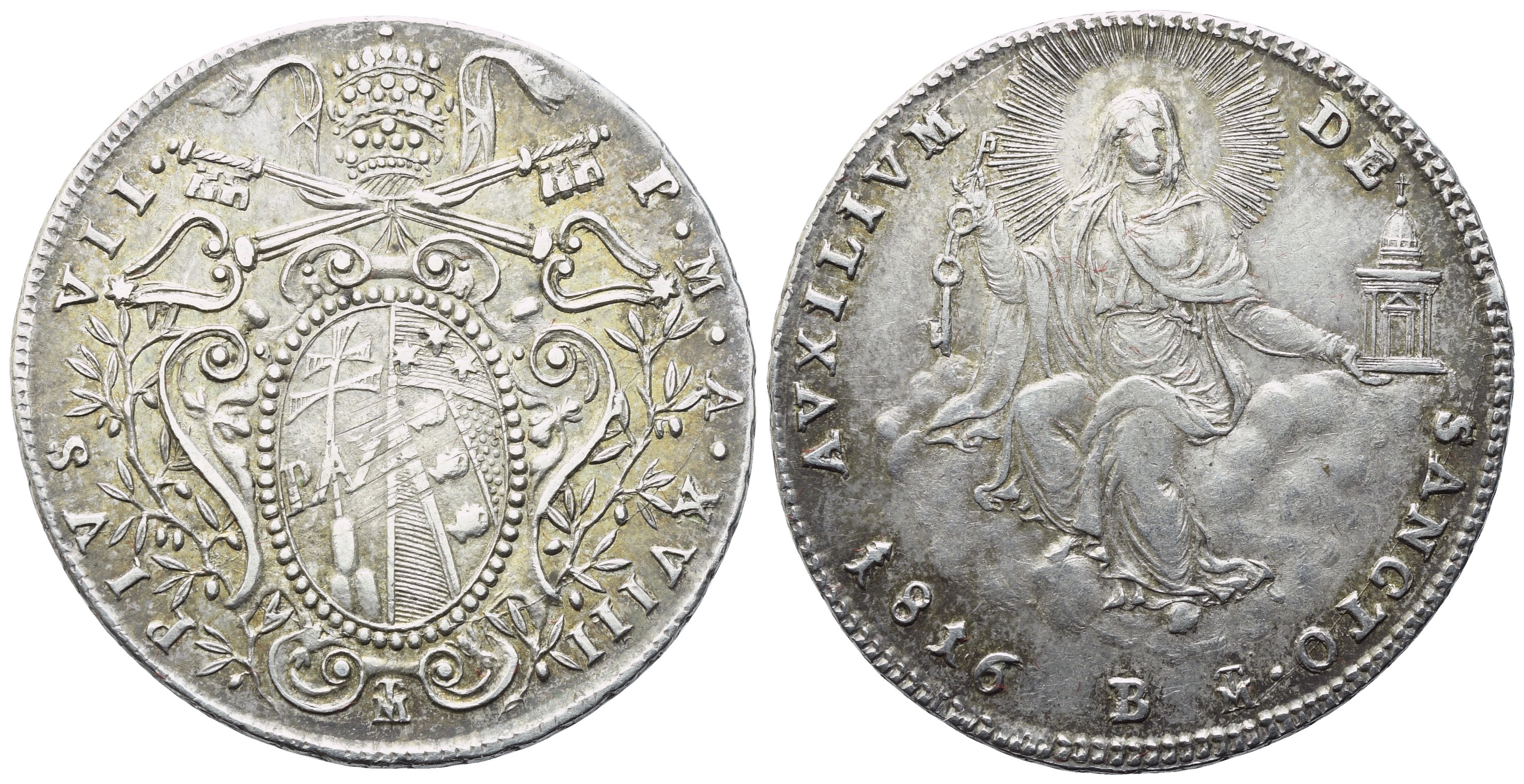 PIVS VII P M A XVIII Stemma sormontato da triregno e chiavi decussate, tra due rami di lauro. Rv.La Chiesa, seduta tra le nubi, con chiavi e tempio. Munt. 39c; Pag. 91a; Gig. 40. Raro. qSPL. Patina di collezione.