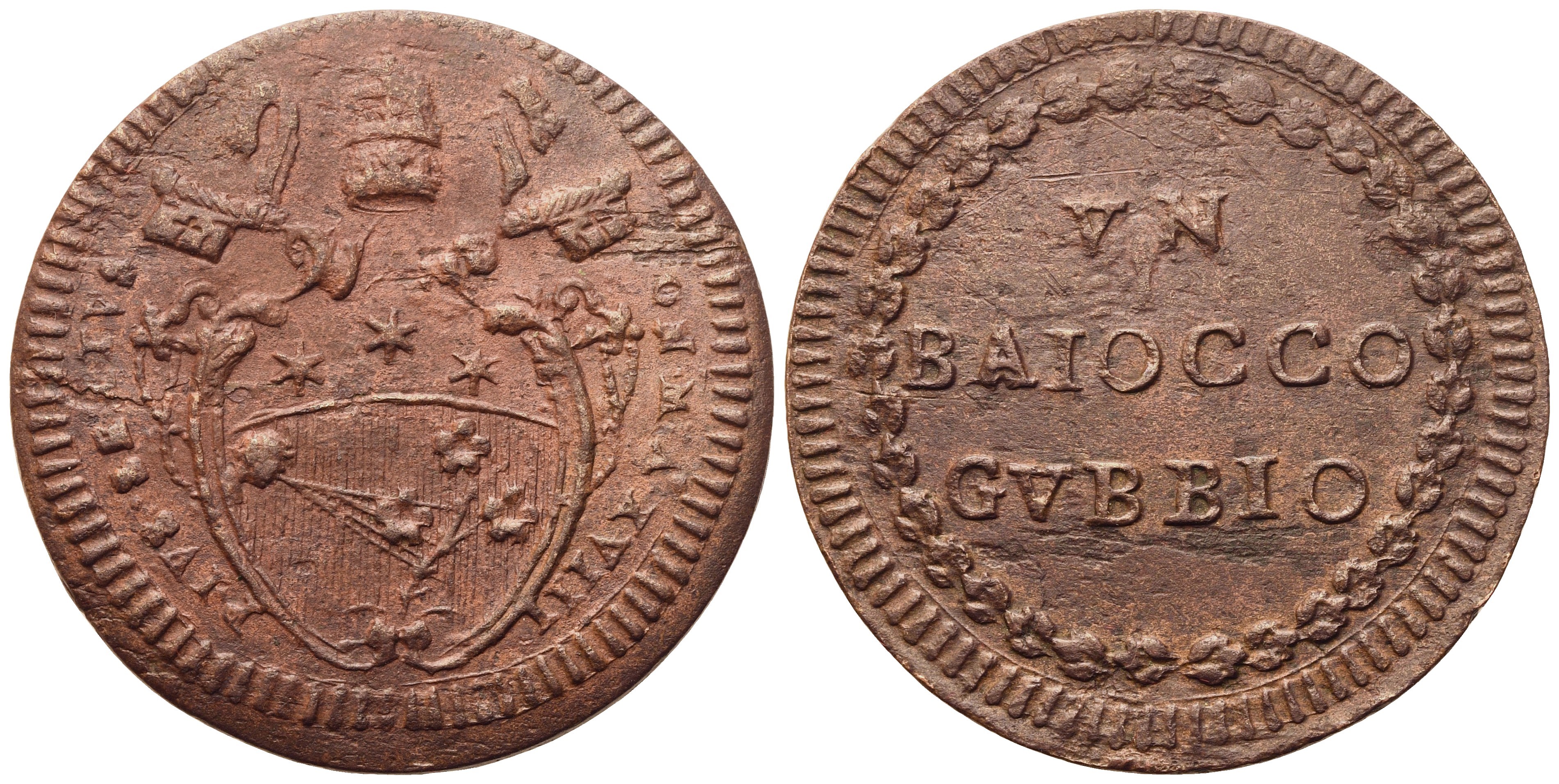 PIVS SEXTVS PON M A XVIII Stemma sormontato da triregno e chiavi decussate. Rv. VN / BAIOCCO / GVBBIO in ghirlanda. Berm. 3112; Munt. 360. qSPL