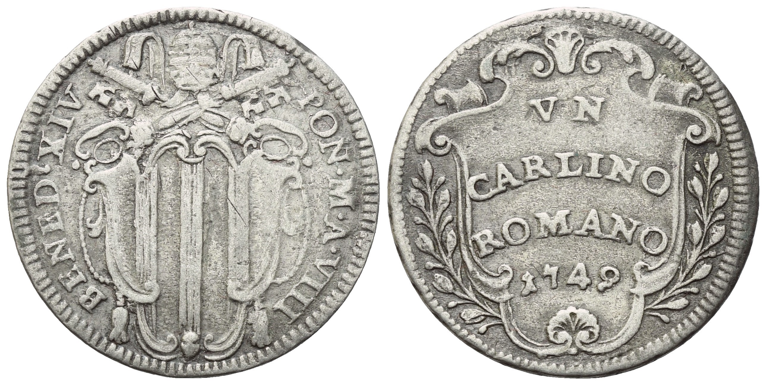 BENED XIV PON M A VIII Stemma sormontato da triregno e chiavi decussate. Rv. VN / CARLINO / ROMANO / 1749 entro cartella con due rami salienti; conchiglia in cimasa. Munt. 154b. BB+/qSPL