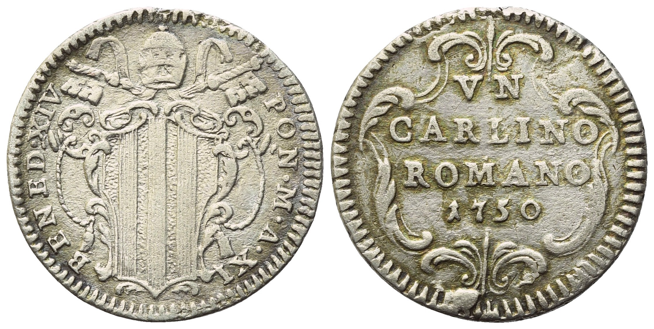 BENED XIV PON M A XI Scudo sormontato da triregno e chiavi decussate. Rv. VN / CARLINO / ROMANO / 1750 entro cartella a targa. Munt. 156b; MIR 2619/8. Molto raro. SPL.