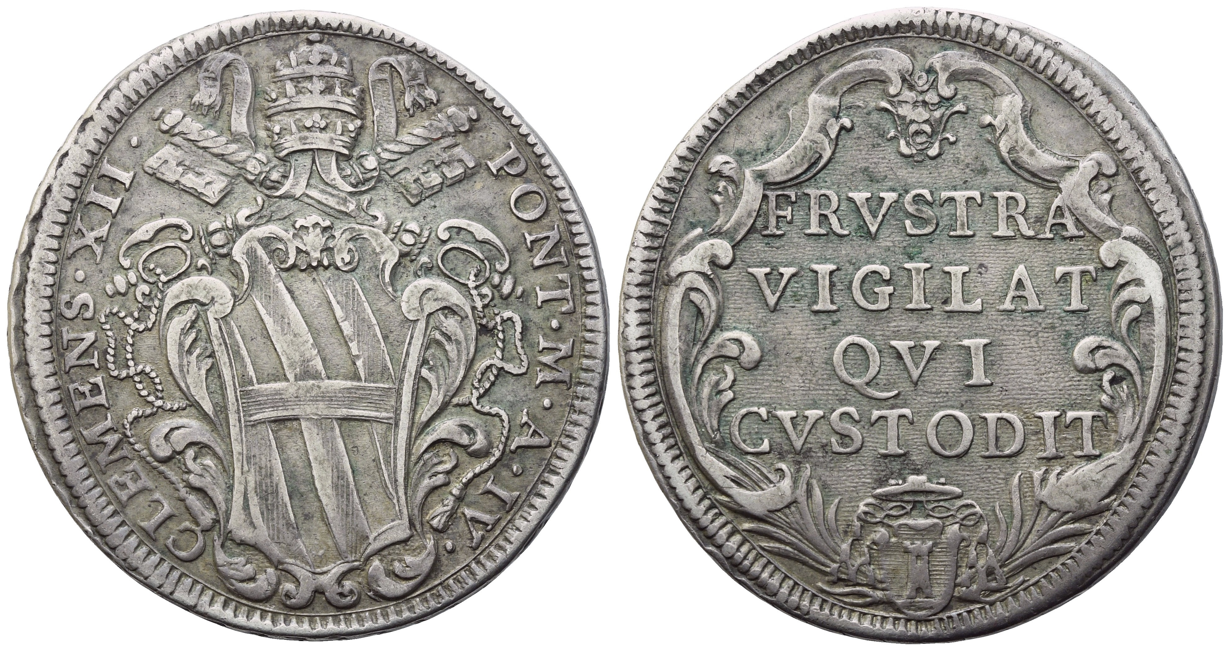 CLEMENS XII - P M A IV Stemma sormontato da triregno e chiavi decussate. Rv. FRVSTRA / VIGILAT / QVI / CVSTODIT Iscrizione disposta su quattro righe, entro cartella ornata in alto da maschera; in basso, armetta Casoni. (Cfr. Salmi, 126, 1: «Nisi Dominus custodierit civitatem, frustra vigilat qui custodit eam»). Munt. 20; B. 2618. SPL+. Splendido esemplare corredato da patina di antica collezione.