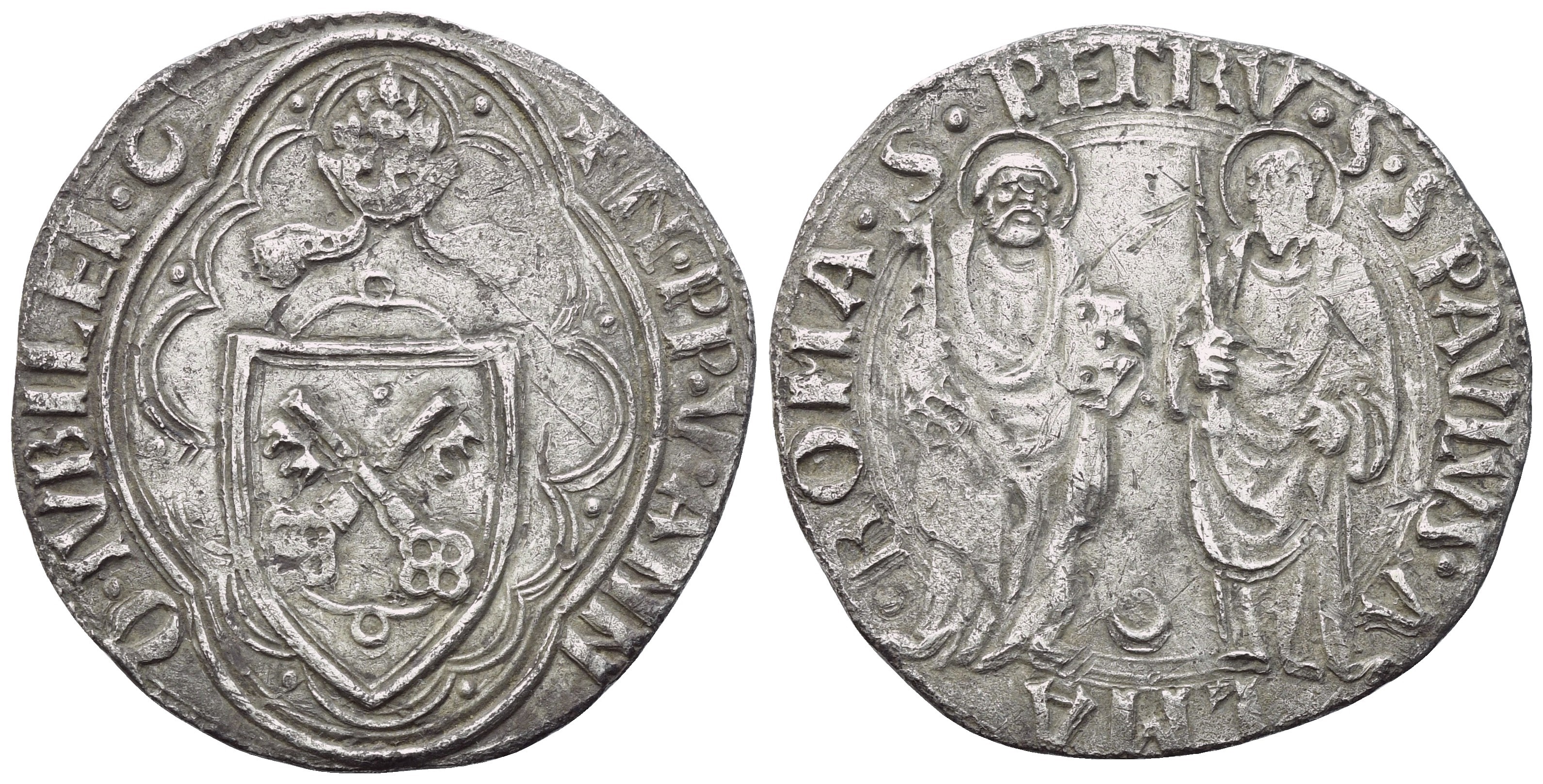 + N PP V ANN – O IVBILEI (crescente) Stemma sormontato da triregno e chiavi decussate, in cornice centinata quadrilobata. Rv. S – PETR – VS S PAVLVS – ALM – A ROMA San Pietro e San Paolo stanti di fronte; in basso, tra i due Santi, crescente. Muntoni 11. Berman 329. MIR 327/2. BB+