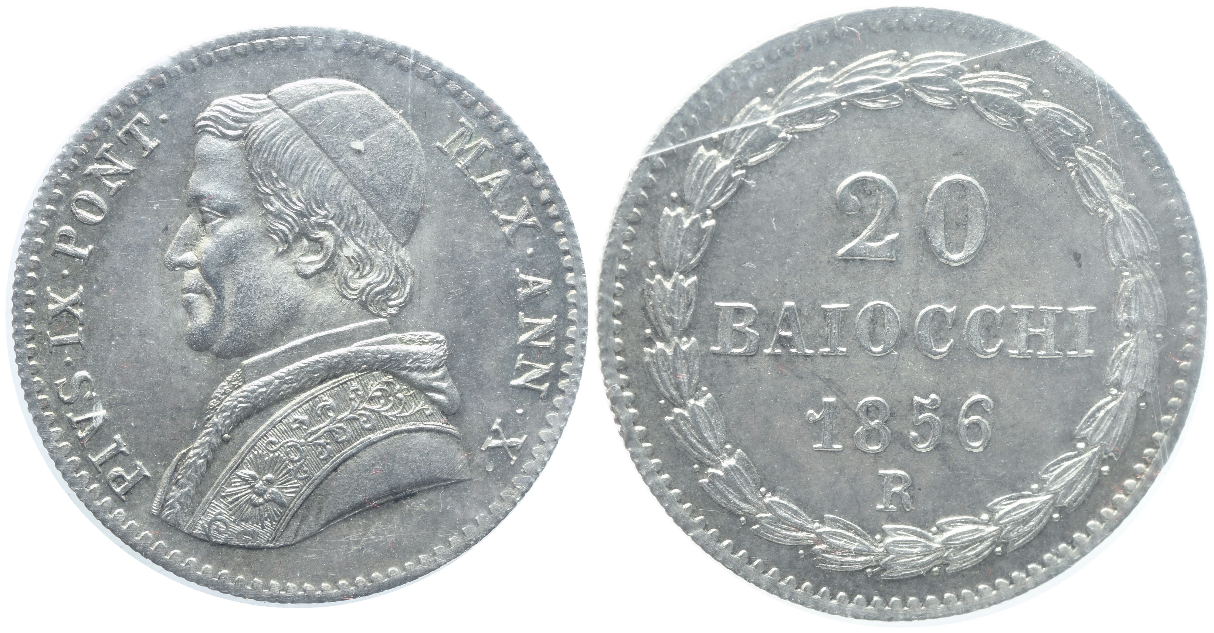 STATO PONTIFICIO. Roma. Pio IX (1846-1870). 20 Baiocchi 1856; Ag (5,3 g; 23 mm)