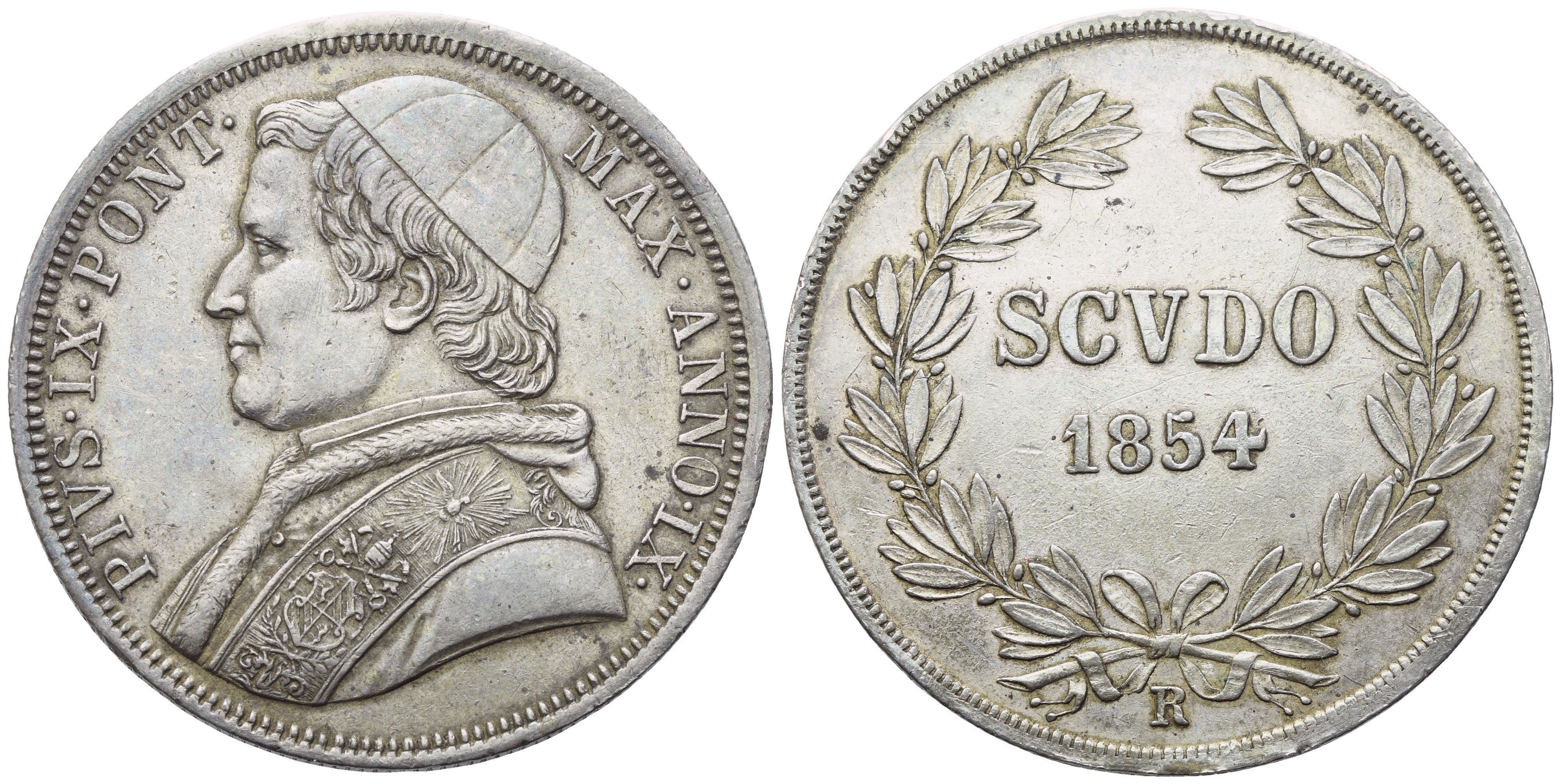 PIVS IX PONT MAX AN IX Busto a sinistra, con zucchetto, mozzetta e piviale. Rv. SCVDO/ 1854 tra rami d'alloro. Mont. 130; Pag. 396; Gig. 65; B. 3309. SPL+. Patina di collezione. Impercettibili colpetti sui bordi.