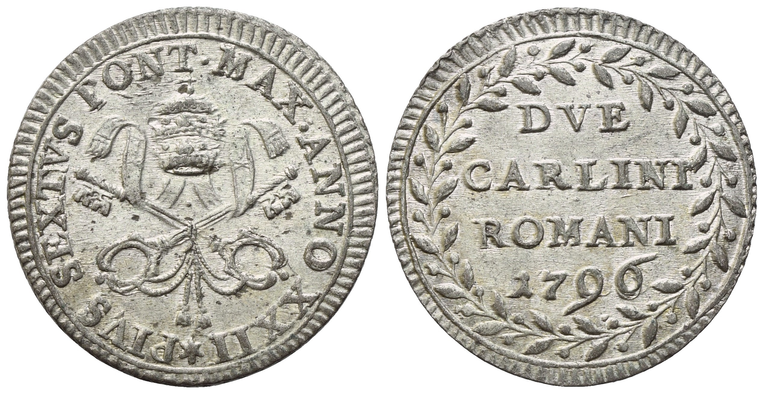 PIVS SEXTVS PONT MAX ANNO XXII Chiavi decussate con doppi cordoni e fiocchi pendenti sormontate da tiara. Rv. DVE / CARLINI / ROMANI / 1796. Iscrizione entro ghirlanda sinistrorsa d'alloro. Munt. 82. CNI 343. Sera. 357. Berm. 2978. qFDC