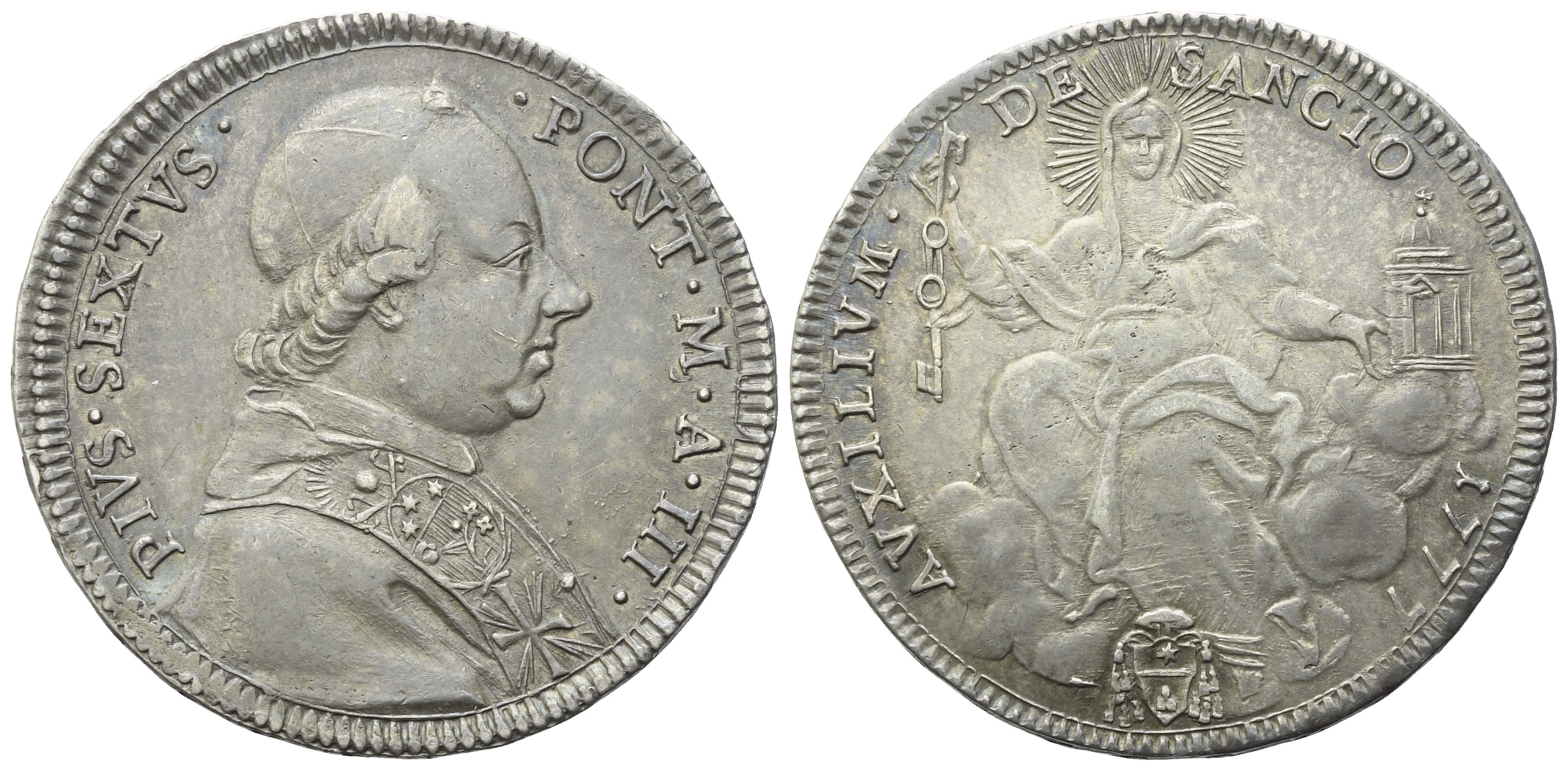PIVS SEXTVS PONT M A III Busto a destra con berrettino e stola ornata da stemma Braschi. Rv. AVXILIVM DE SANCTO 1777 La Chiesa sulle nubi; sotto, armetta Albani. Muntoni 23. Berman 2960. SPL. Patina di antica collezione.