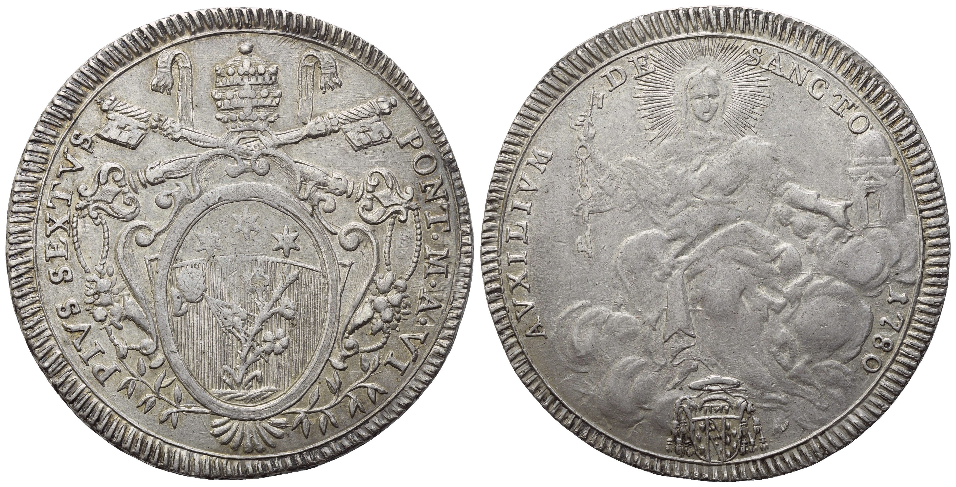 PIVS SEXTVS PONT M A VI Stemma in cornice con due cornucopie ai lati, sormontato da triregno e chiavi decussate. Rv. AVXILIVM DE SANCTO 1780 La Chiesa sulle nubi; sotto, armetta Vai. Muntoni 17. Berman 2958. MIR 2764/4. Davenport 1471. SPL/qSPL. Patina di collezione.