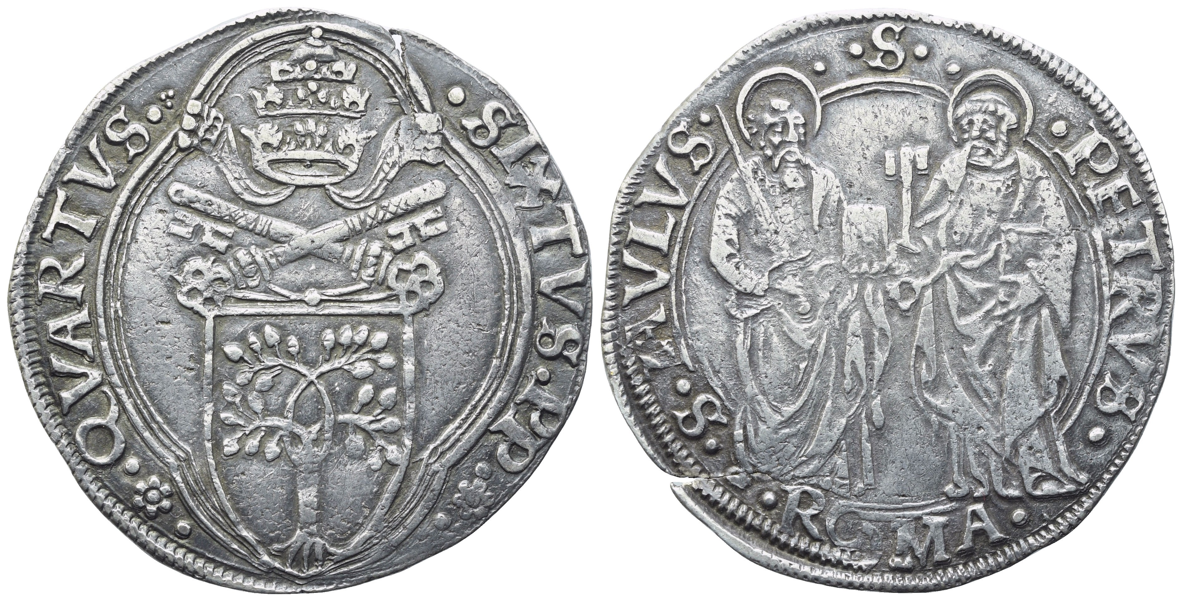 SIXTVS PP PP – QVARTVS Stemma sormontato da triregno chiavi decussate, entro cornice quadrilobata. Rv. S – PETRVS – S PAVLVS S. Pietro e S. Paolo stanti di fronte; sotto, nel giro, ROMA. Muntoni 22. Berman 452. MIR 455/3. BB/SPL. Patina di collezione.