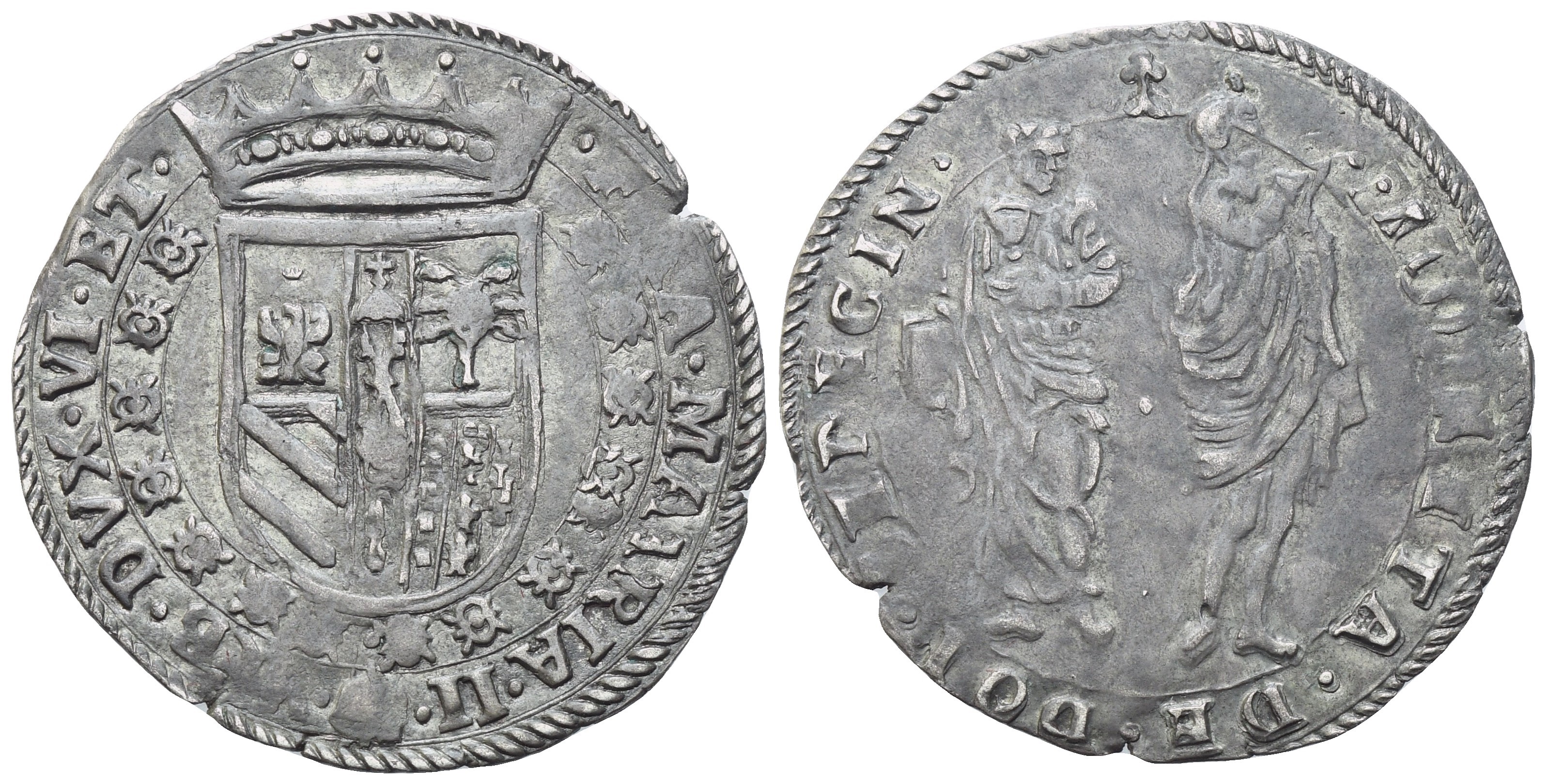Stemma coronato circondato da collare dell’ermellino. Rv. San Giovanni evangelista e San Girolamo stanti. Cavicchi 203. BB+
