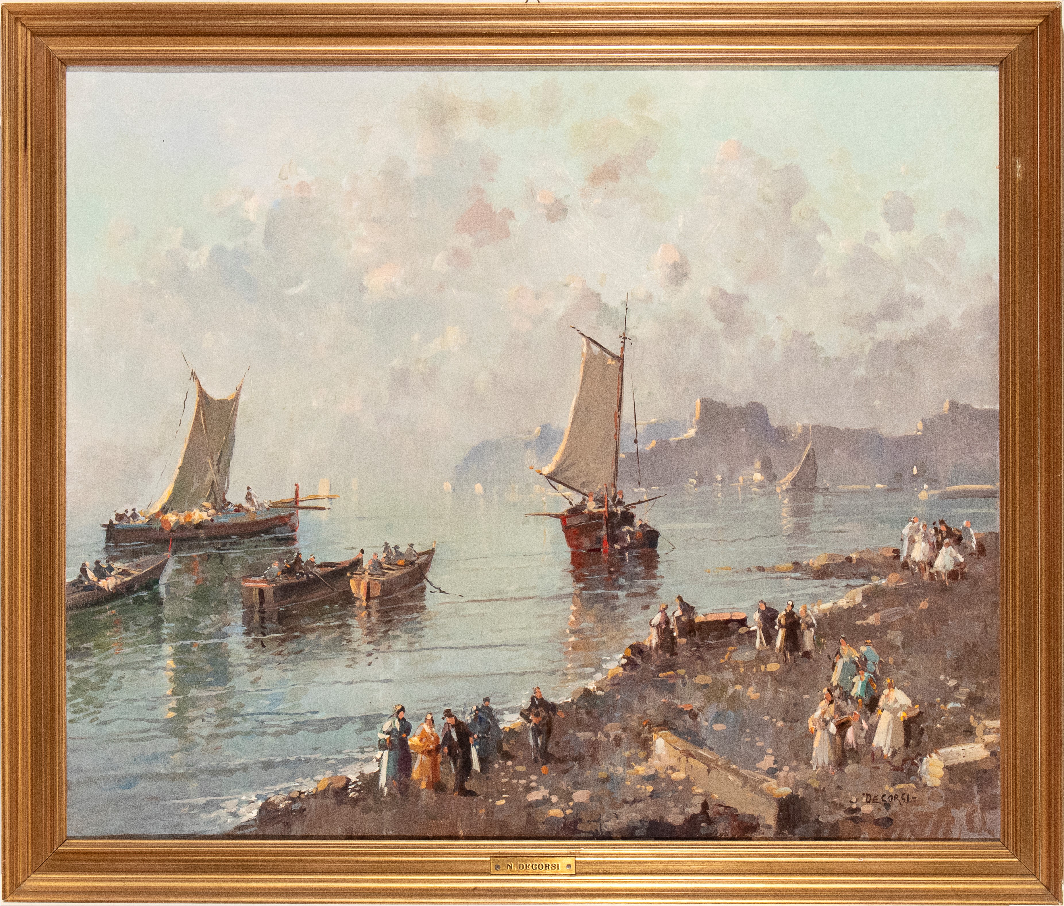 Marina con spiaggia, figure a passeggio e imbarcazioni