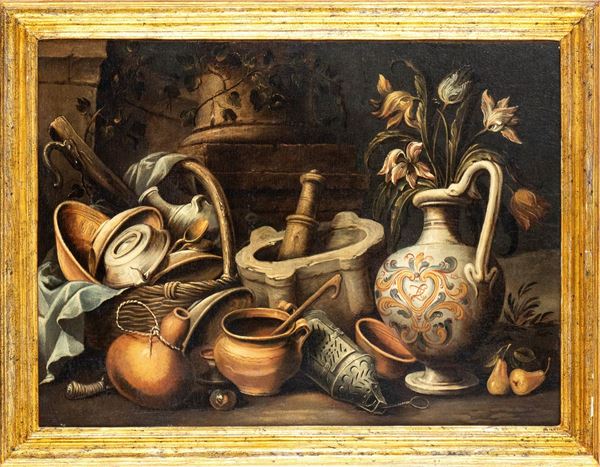 Natura morta con stoviglie, mortaio e vaso di fiori...